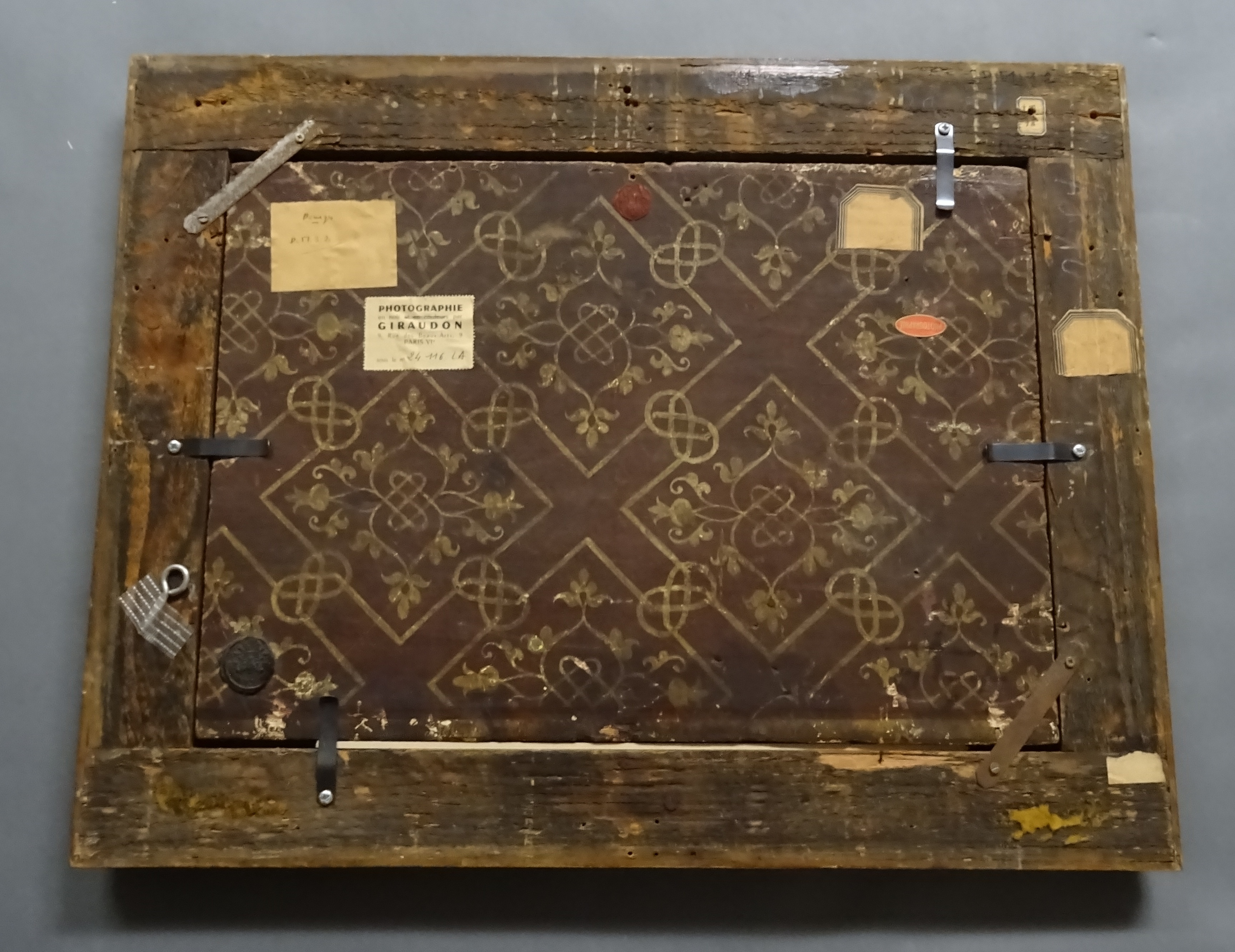 Sur le montant droit : A la craie blanche « 217 840 ...[caché par étiquette]... » ; étiquette coupée à coins coupés avec liseré bleu « MNR 309 (confusion avec MNR 308)/École italienne/... » ; au crayon de papier « 34 X ... ».