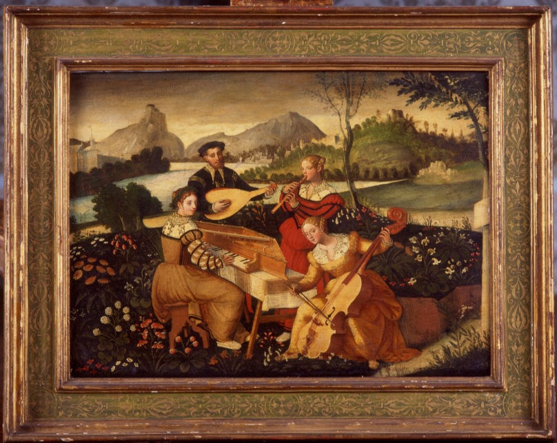 scène (divertissement, musique, formation instrumentale, homme, femme, épinette, ?, luth, flûte à bec, violoncelle, robe, bijou, coiffure) ; fond de paysage (végétation, fleur, feuillu, fleuve, colline, montagne, architecture urbaine)
