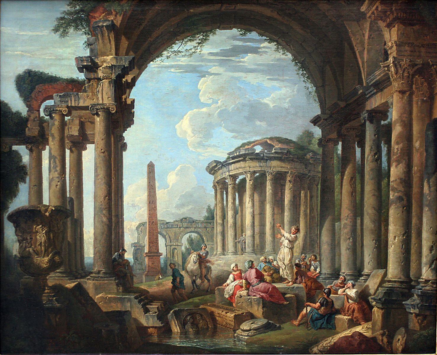scène (prédication, personnage, attroupement, cavalier) ; vue d'architecture (ruines : à l'antique, temple, ?, obélisque monumental, colonne, arcade, architecture ornementale, vase de jardin, végétation)