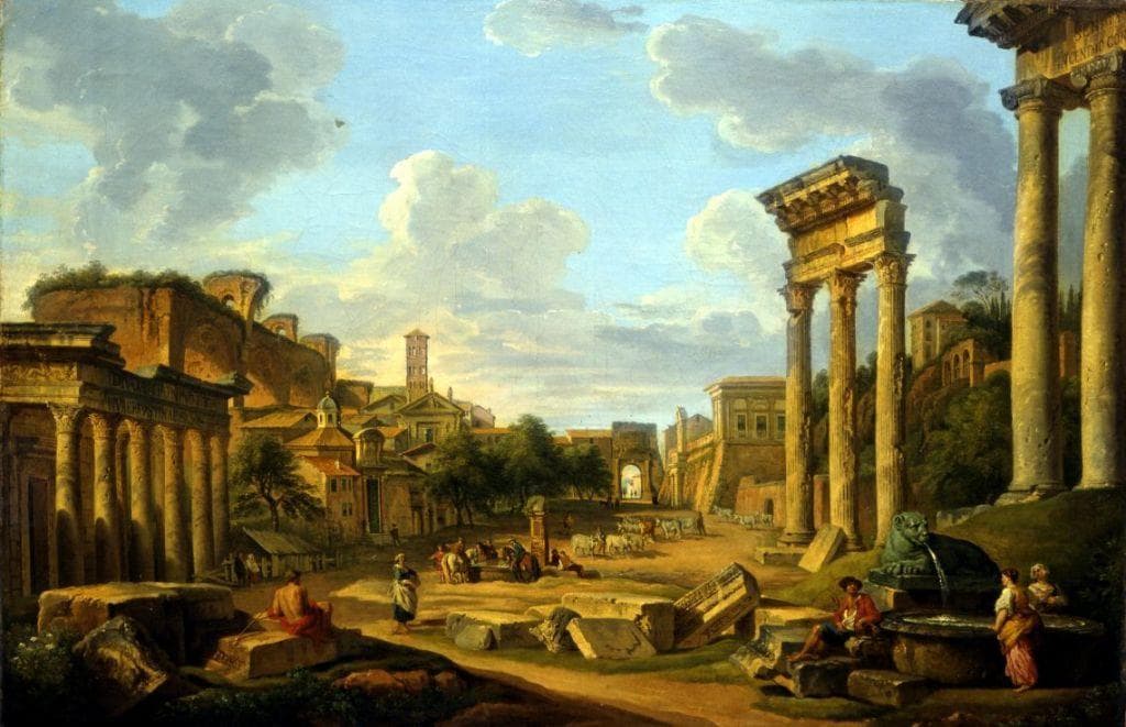 vue d'architecture (Rome, place, ruines, colonne, colonnade, fontaine : lion, architecture urbaine, aqueduc, personnage, bétail, ?, végétation)