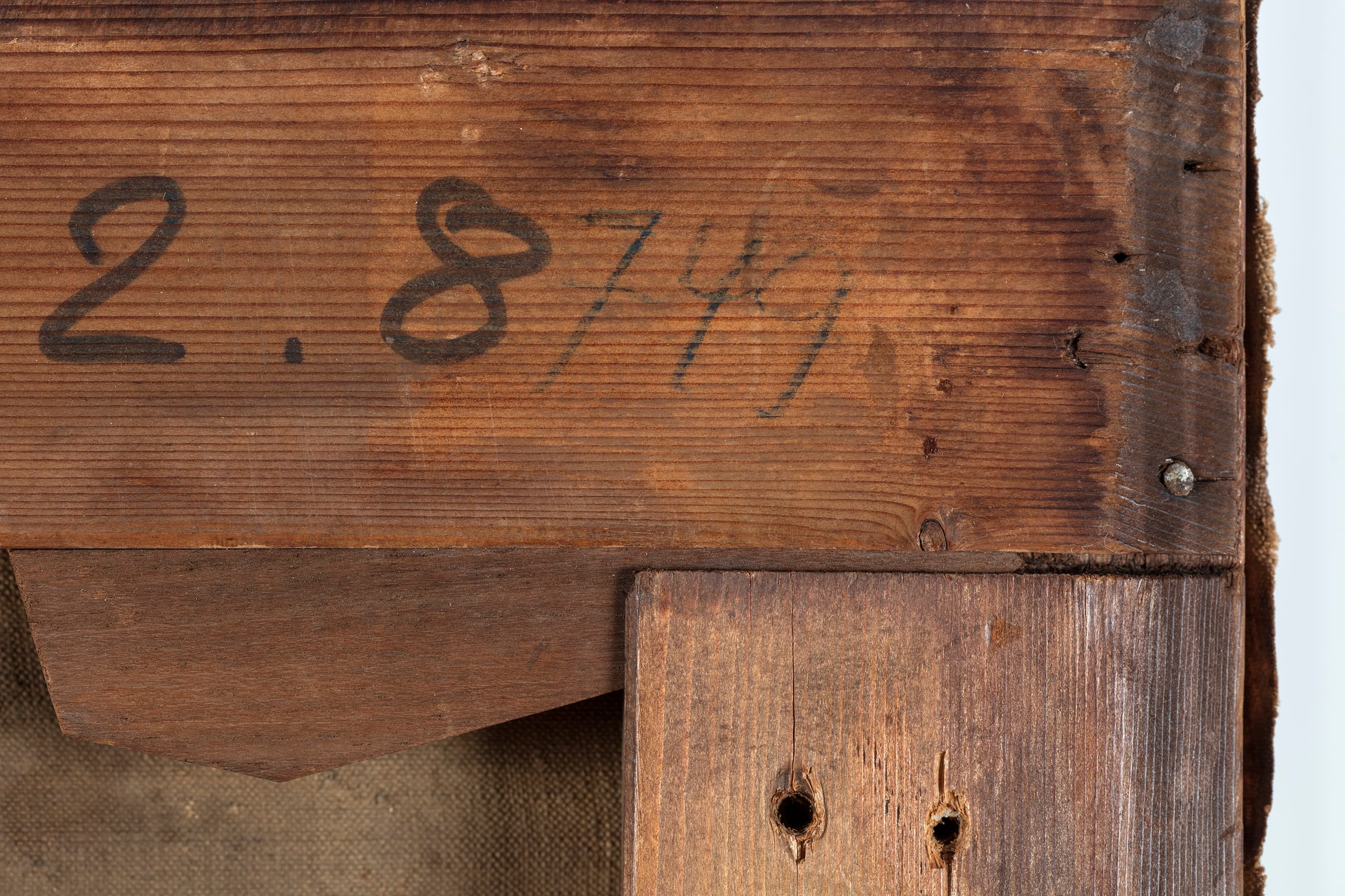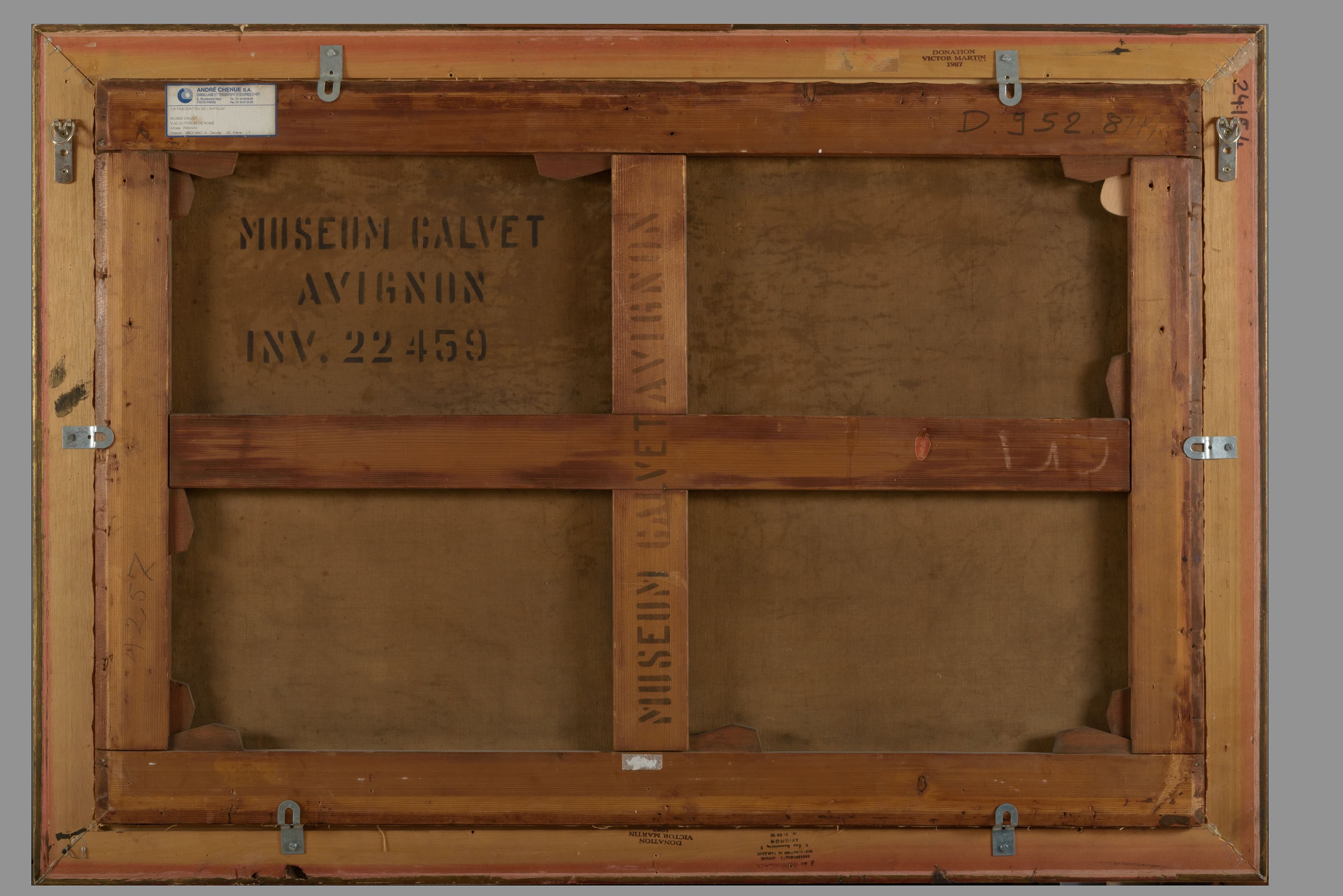 -Sur le châssis : A la craie blanche "B" ; à la craie bleue "4257" ; "749" ; au tampon noir "Museum Calvet Avignon" ; étiquette ovale rouge "Photographié" ; étiquette rectangulaire illisible.
