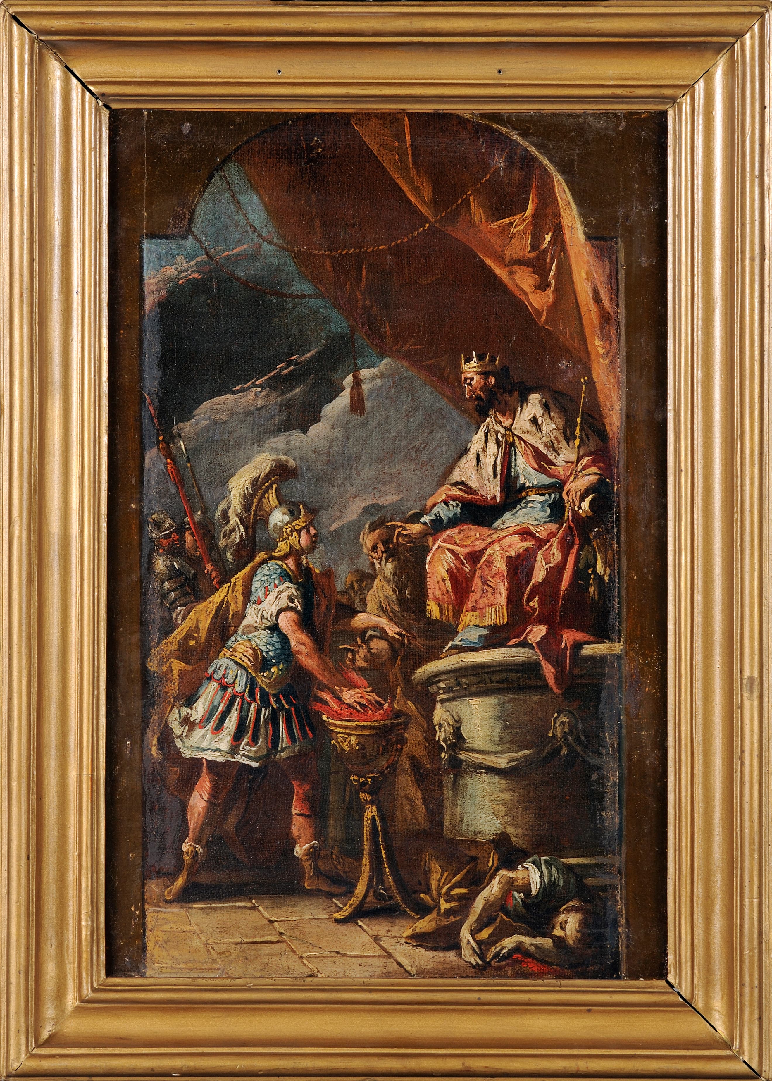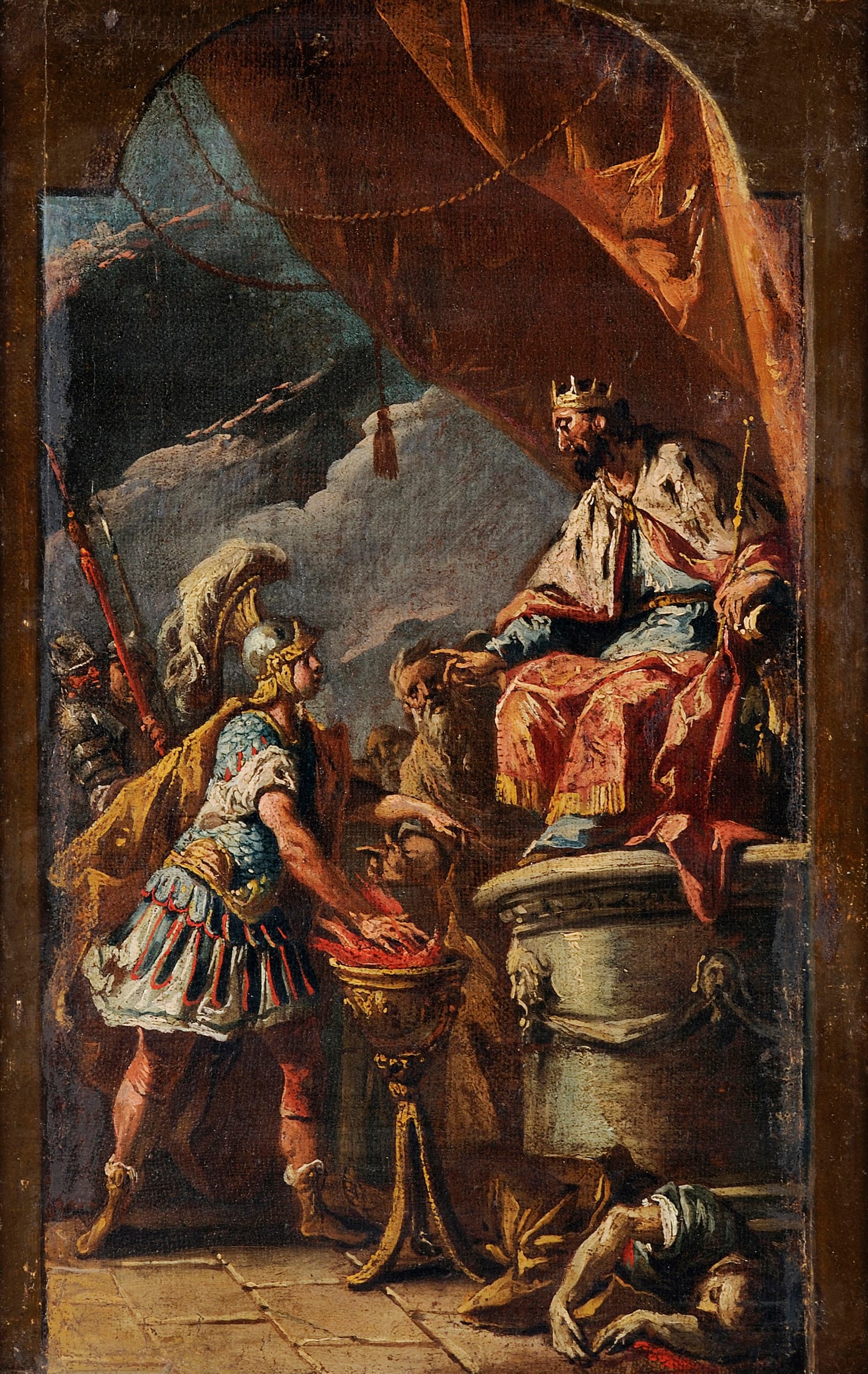 scène historique (Mucius Scevola, soldat : Romain, captivité, guerre, Étrusque, Porsenna : roi, trône, sentence, torture, feu, main : brûlé, personnage)