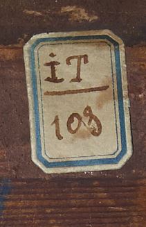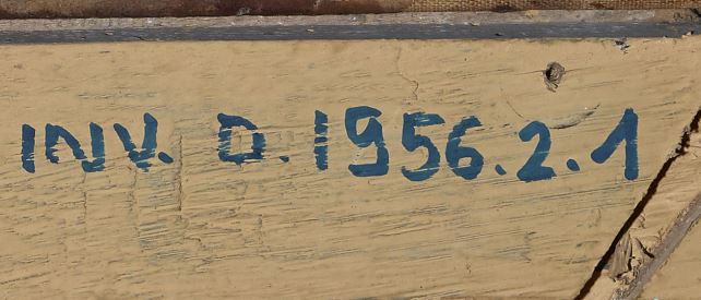 Sur la traverse médiane : « INV.D.1956.2.1 » en noir ; à la craie jaune : « 3895 »..