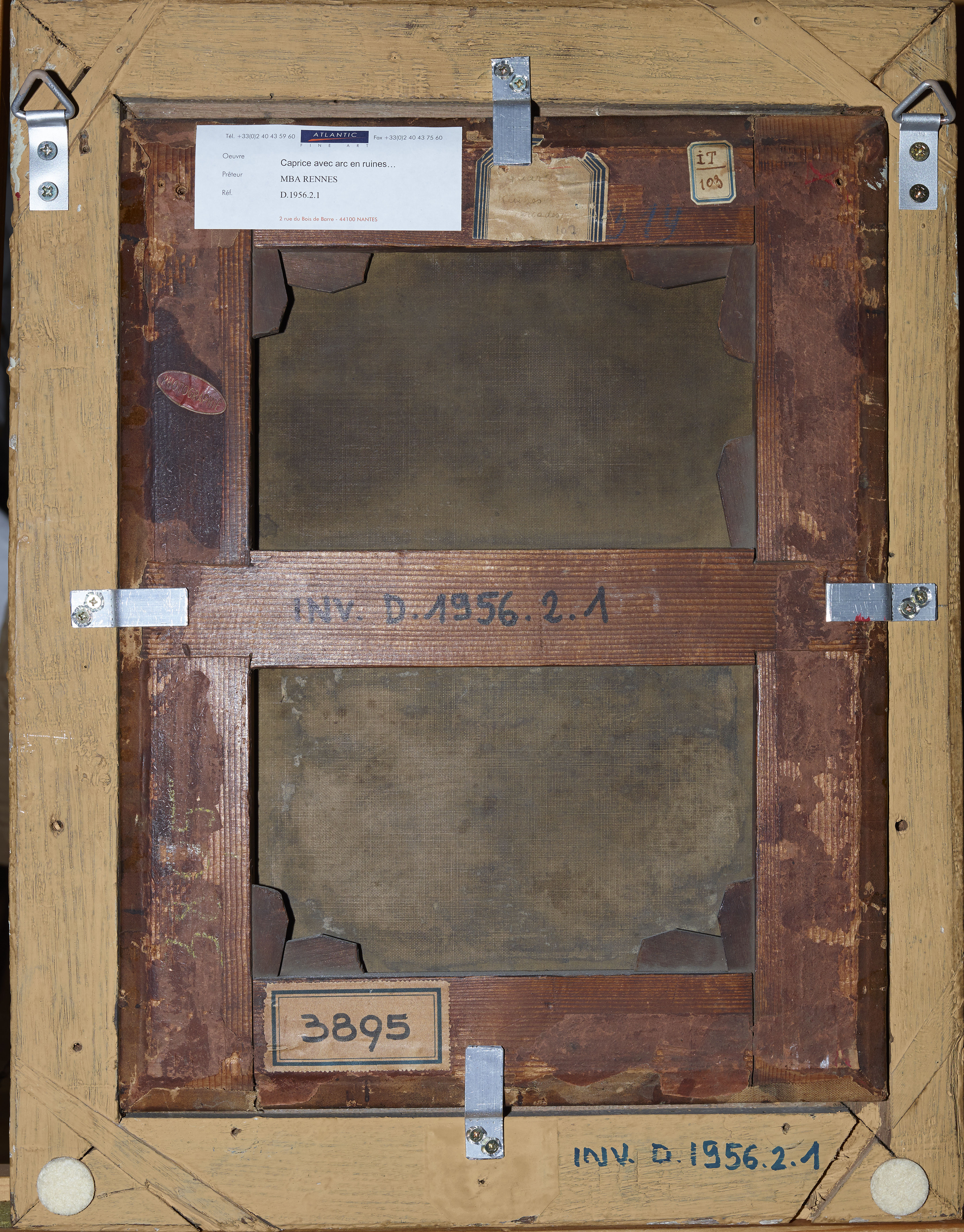 Sur le montant supérieur : A gauche, étiquette rectangulaire « Tel. 330240435960 -Atlantic Fine Art .../Œuvre : Caprice avec arc en ruines/Prêteur MBA Rennes/ Réf. D.1953.2.1/2 rue du Bois de Barre-44100 NANTES » ; étiquette rectangulaire à pans coupés bordée de bleu coupée : « ... Guardi/Ruines/Arcades/107 » ; en bleu « ...319 » ; étiquette rectangulaire bordée de bleu « IT (souligné)/103 ».