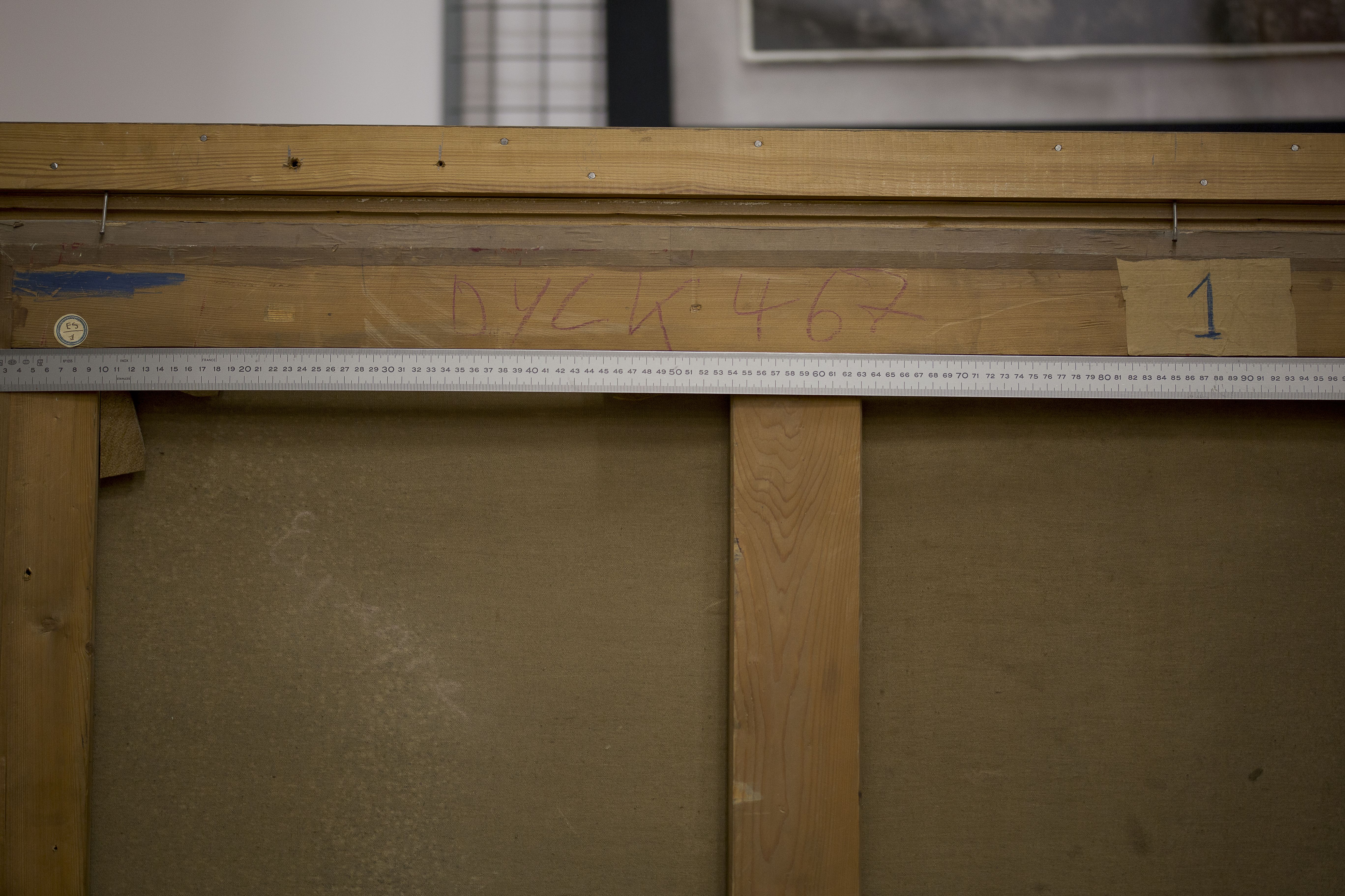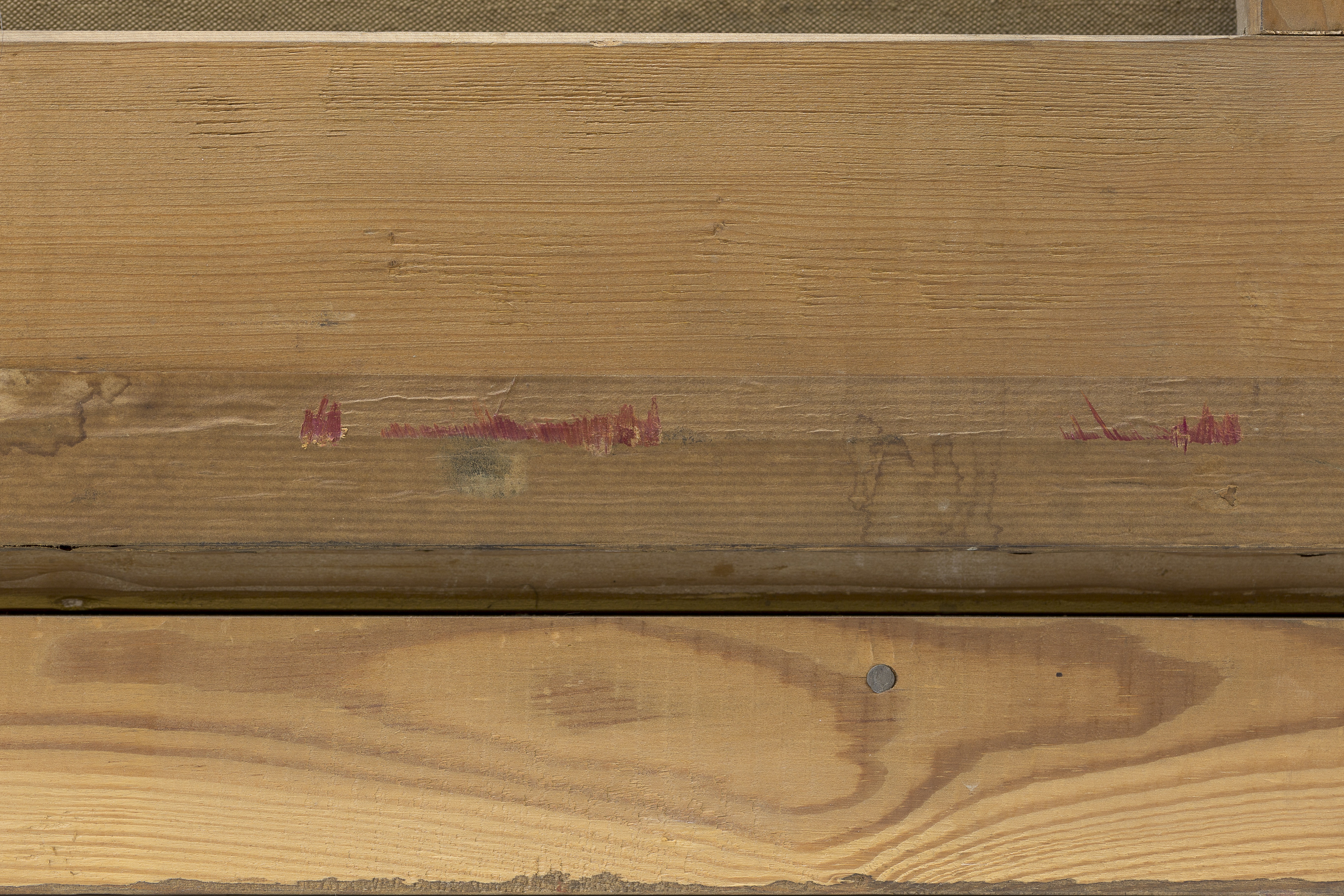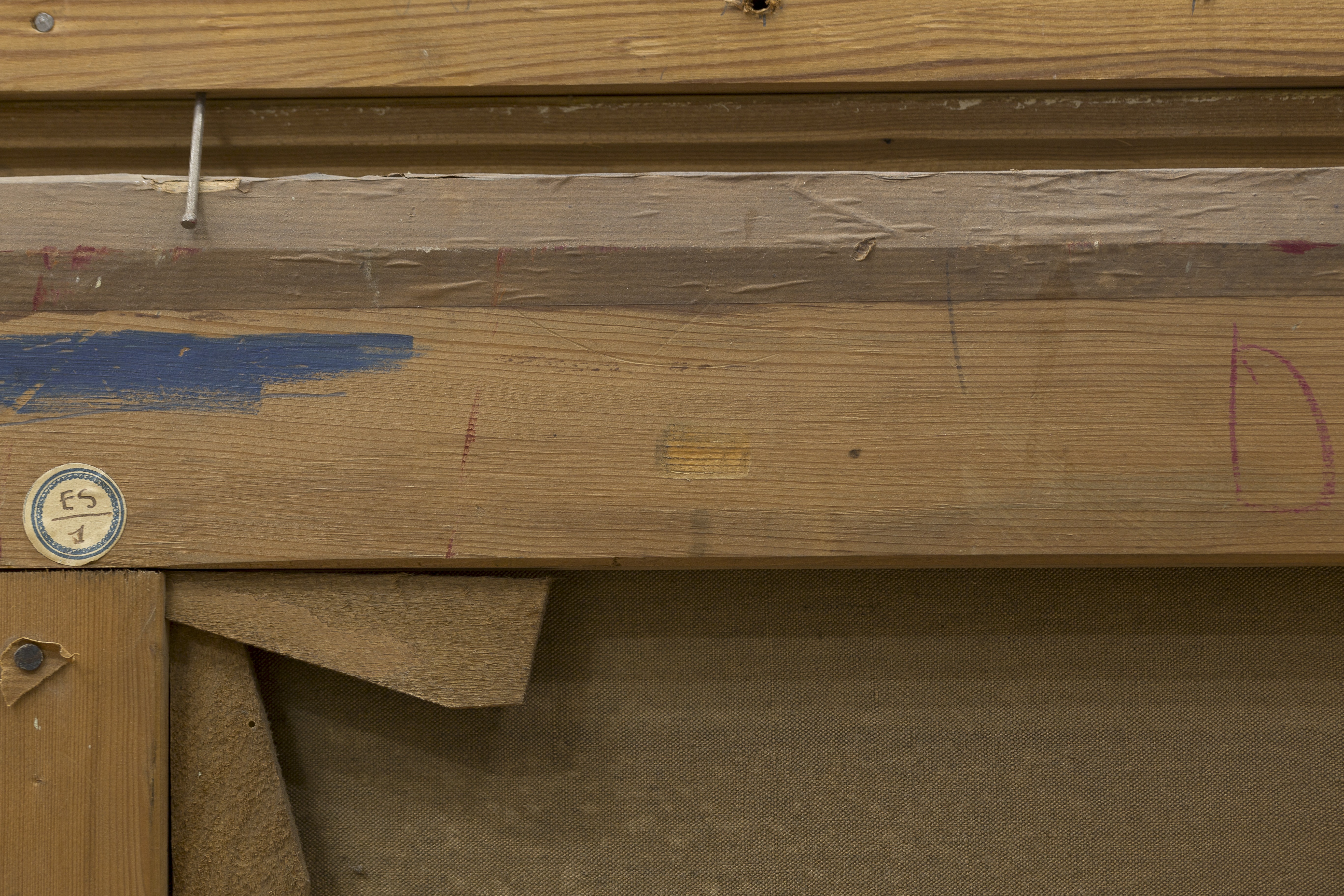 -Montant supérieur : Étiquette ronde à liseré décoratif « ES/1 » ; traits de craie bleue ; étiquette rectangulaire à liseré non lisible ; à la craie rouge « DYCK 467 » ; étiquette (papier découpé) « 1 ».