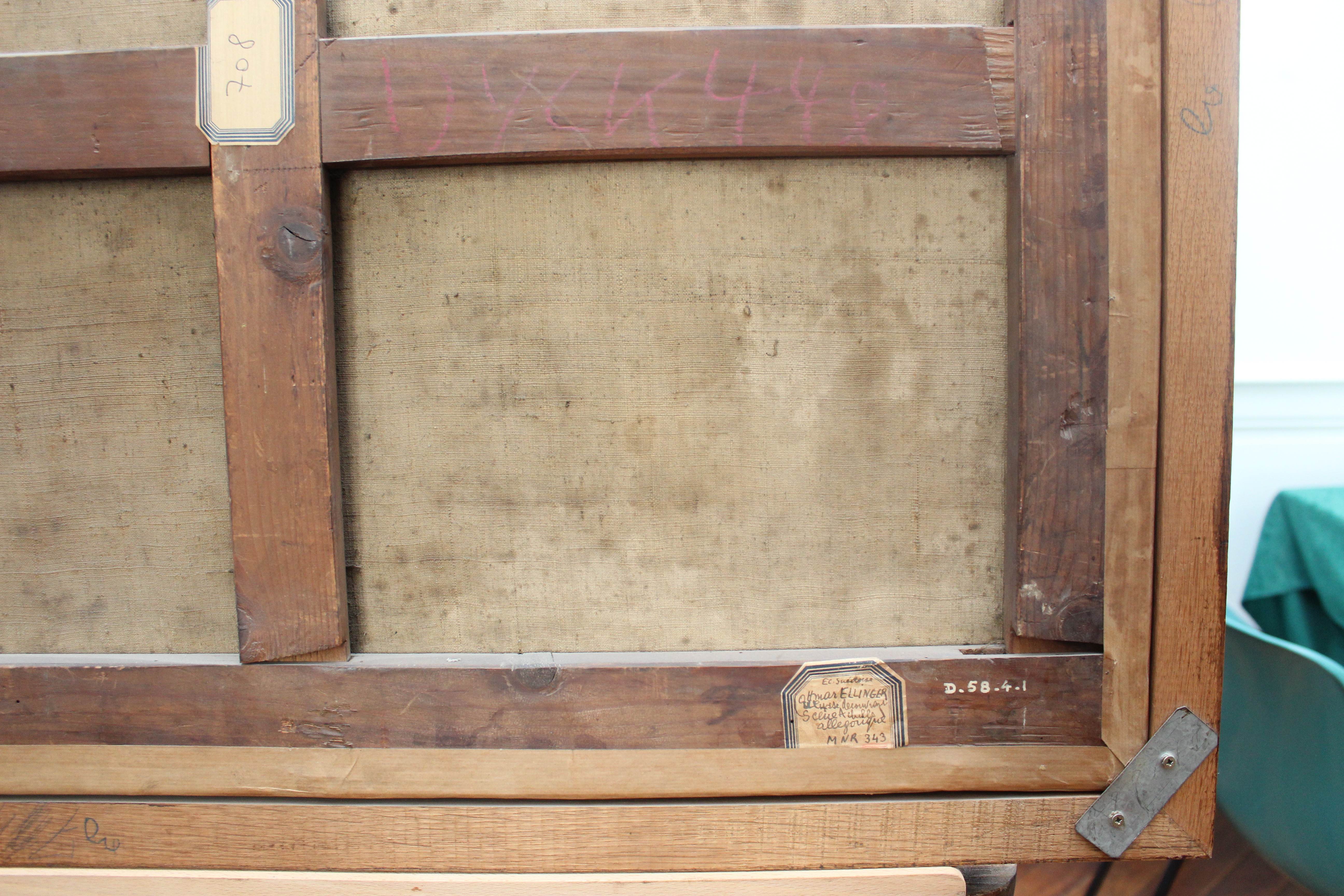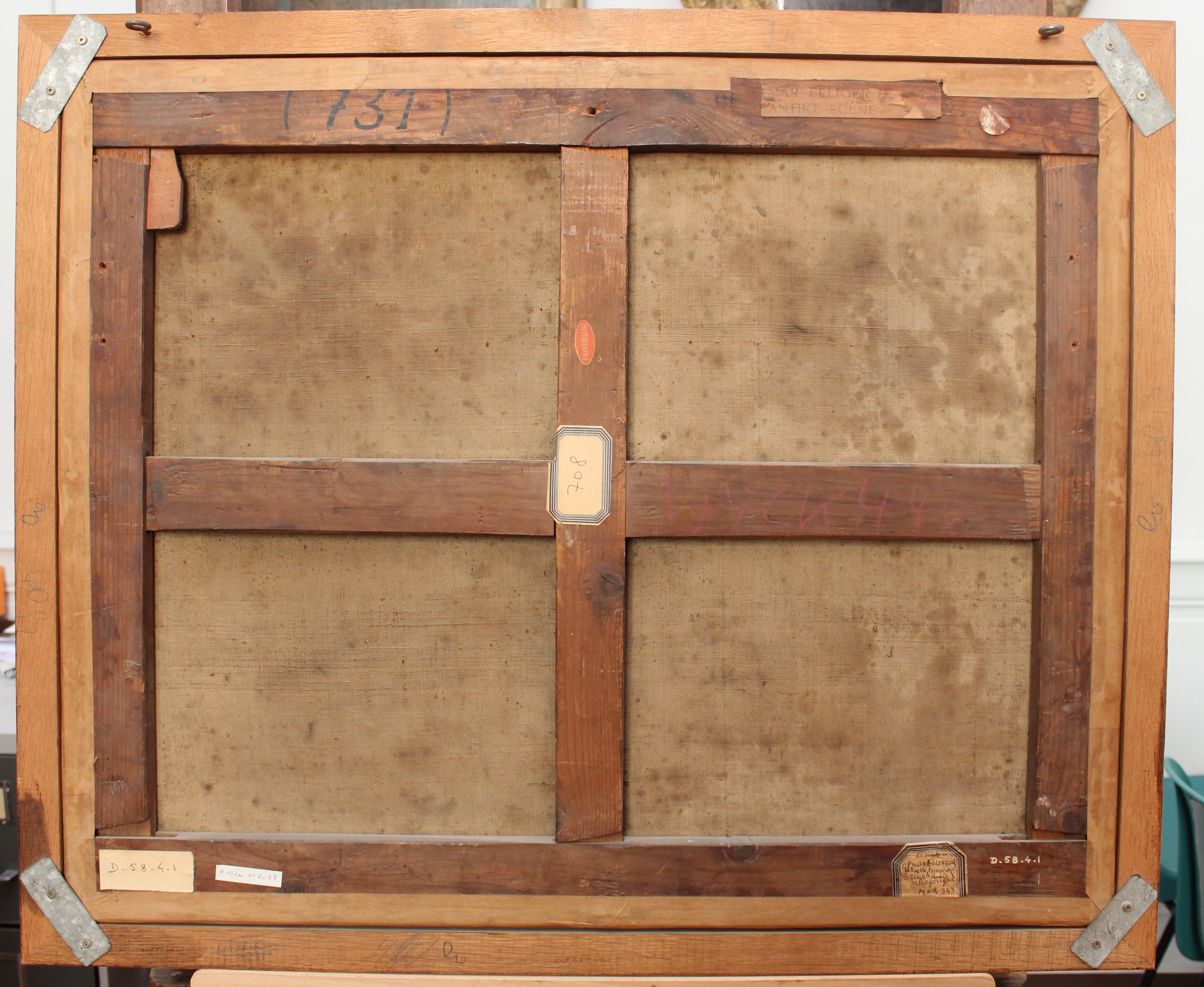 -Montant inférieur : Papier collé "D. 58-4-1" ; papier coupé "R 05/10 n° 6033" ; à l'encre blanche "D. 58-4-1" ; demi-étiquette rectangulaire à coins coupés et listel bleu "Ec. suédoise/Ottmar Ellinger [sic]/Ulysse découvrant Achille/Scène allégorique/MNR 343".