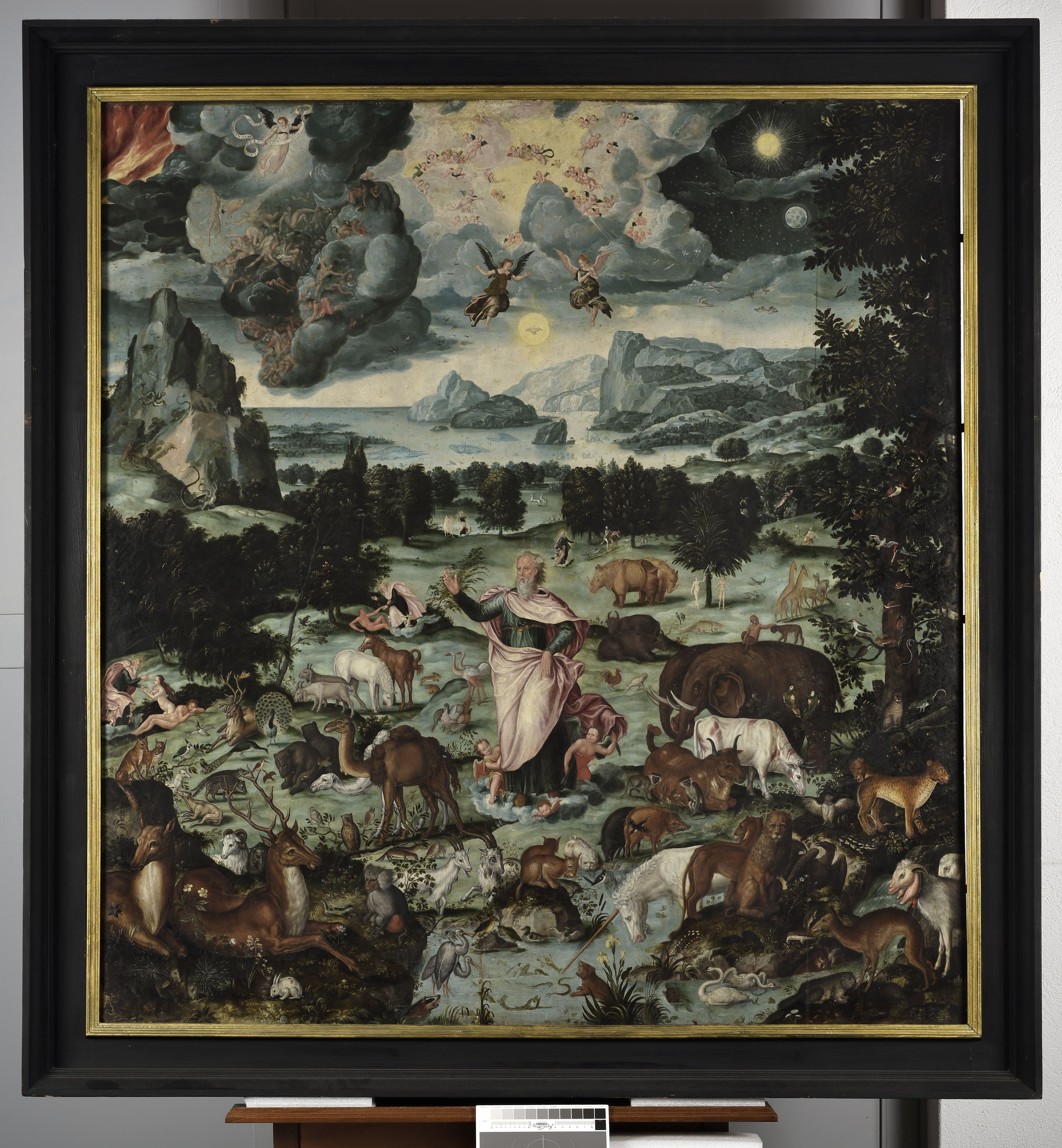 scène biblique (Dieu le père, créateur, chaos, ?, terre, soleil, lune, ciel, nuée, ange, mammifère) ; fond de paysage (pré, paradis terrestre, colline, feuillu, mer, rocher, montagne)