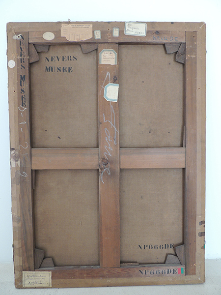 Sur le montant gauche : A la craie blanche "S.1.2...9 (?)" ; au tampon noir "Nevers musée" ; étiquette ronde "104 (?)" ; trace d'étiquette.