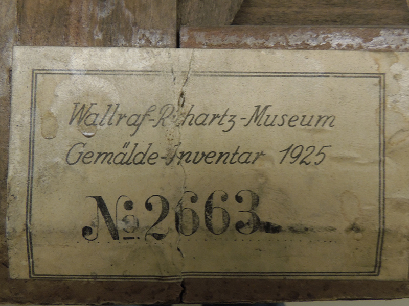 Sur le montant inférieur : Au tampon noir "NP666DE" et deux bandes rouge et vert ; étiquette rectangulaire à listel noir "Wallraf-Richartz Museum/Gemälde Inventar 1925/N° 2663".