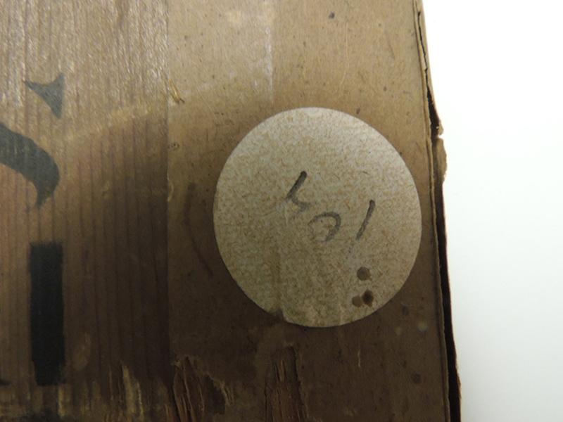 Sur la traverse verticale : A la craie blanche "A" et "Panse ?)" ; étiquette rectangulaire à coins coupés et listel bleu "Sully I/Vest. D. Cas./8 ..." ; étiquette rectangulaire à coins coupés et listel bleu "MNR 371/Magnasco/Nonnes nattant des paniers".
