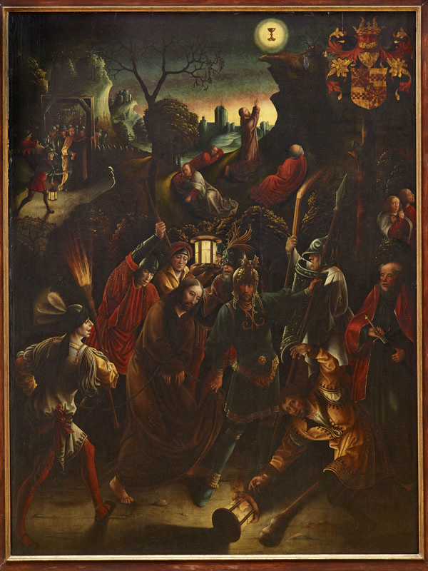 scène biblique (Jardin des oliviers, prière, apôtre : sommeil) ; scène biblique (Arrestation du Christ, saint Pierre, violence) ; fond de paysage (arbre, rocher, personnage, rempart)