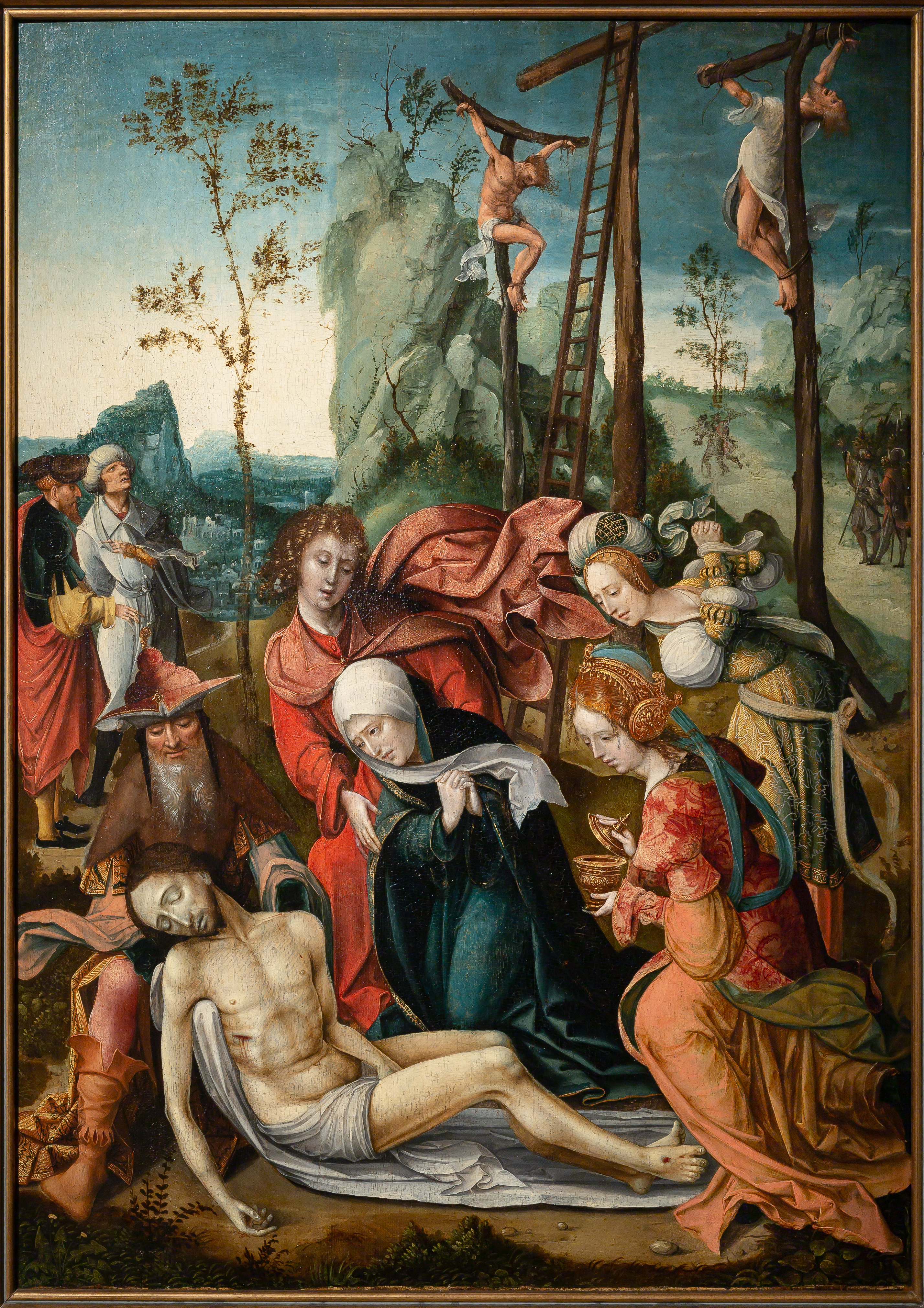 scène biblique (Déploration, calvaire, femme : douleur, soldat, prêtre, crucifiement) ; fond de paysage (rocher, arbre, ville)