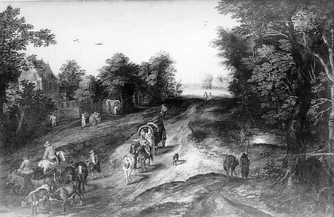 Certainement la "Route dans un paysage de forêt avec voiture et bétail" achetée le 24 novembre 1941 chez Gustav Rochlitz par Karl Haberstock et revendue le 5 janvier 1942 pour 32 500 RM au musée de Linz (1) ; il y est inventorié sous le numéro 2144 (2).