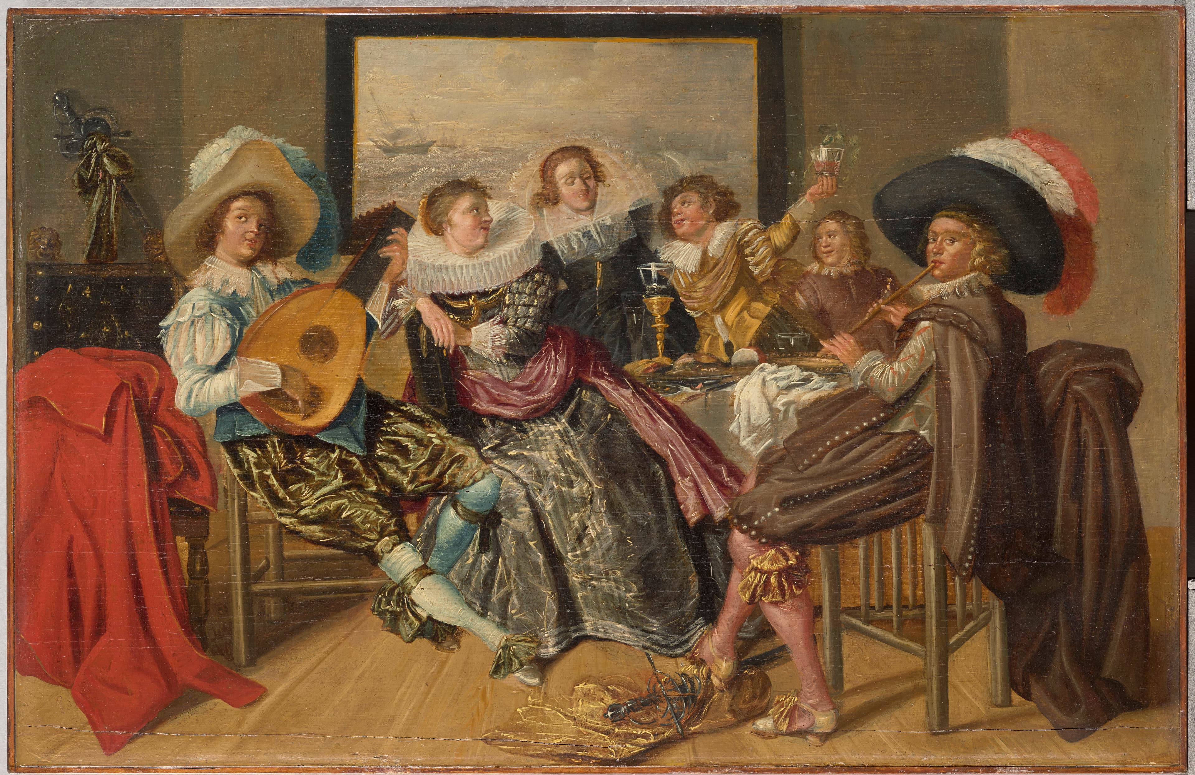 scène (jeunes gens, galanterie, collation, luth, flûte à bec, vêtement, peinture