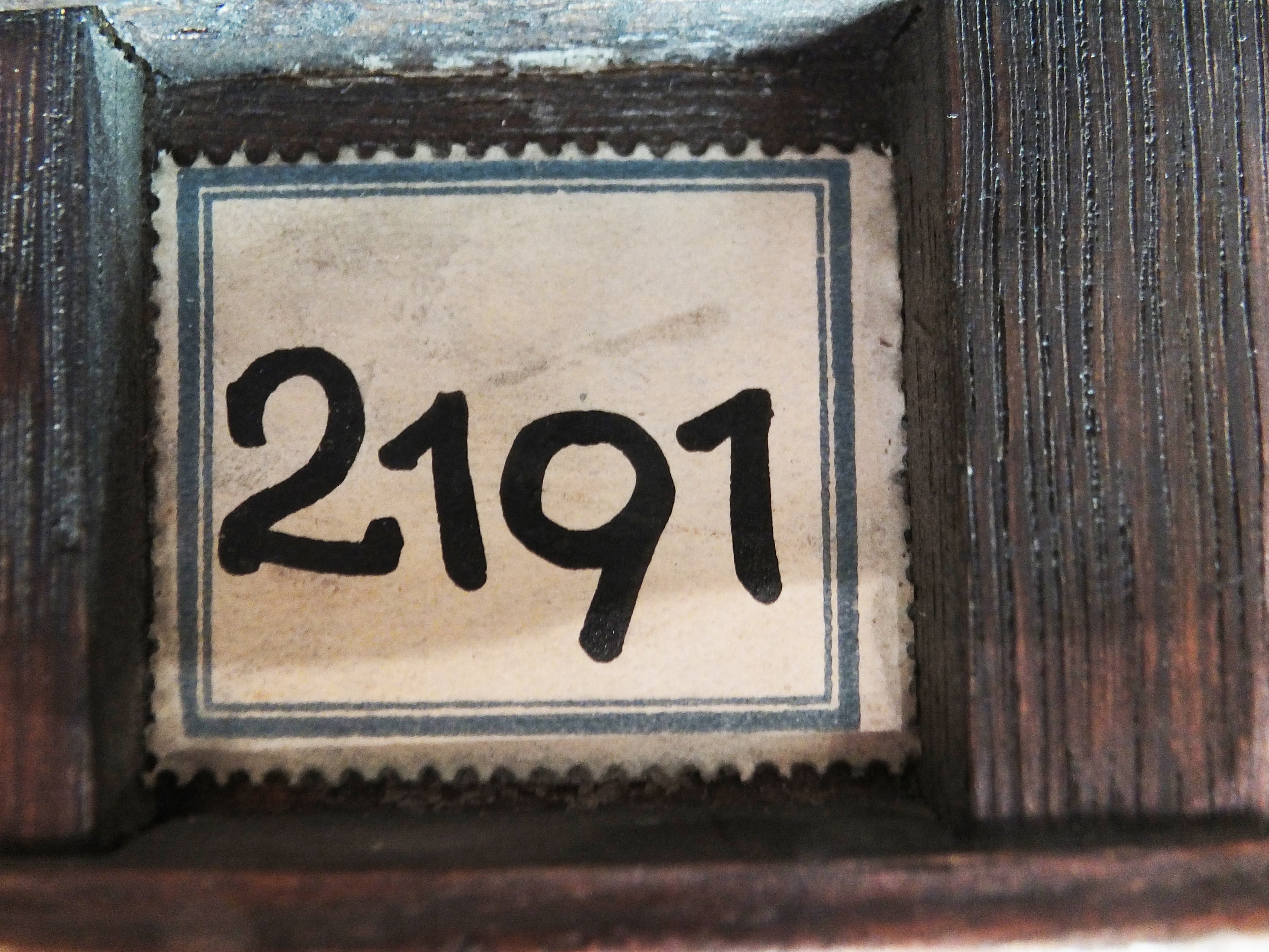 Sur le panneau : Étiquette rectangulaire dentelée à liseré bleu "2191".
