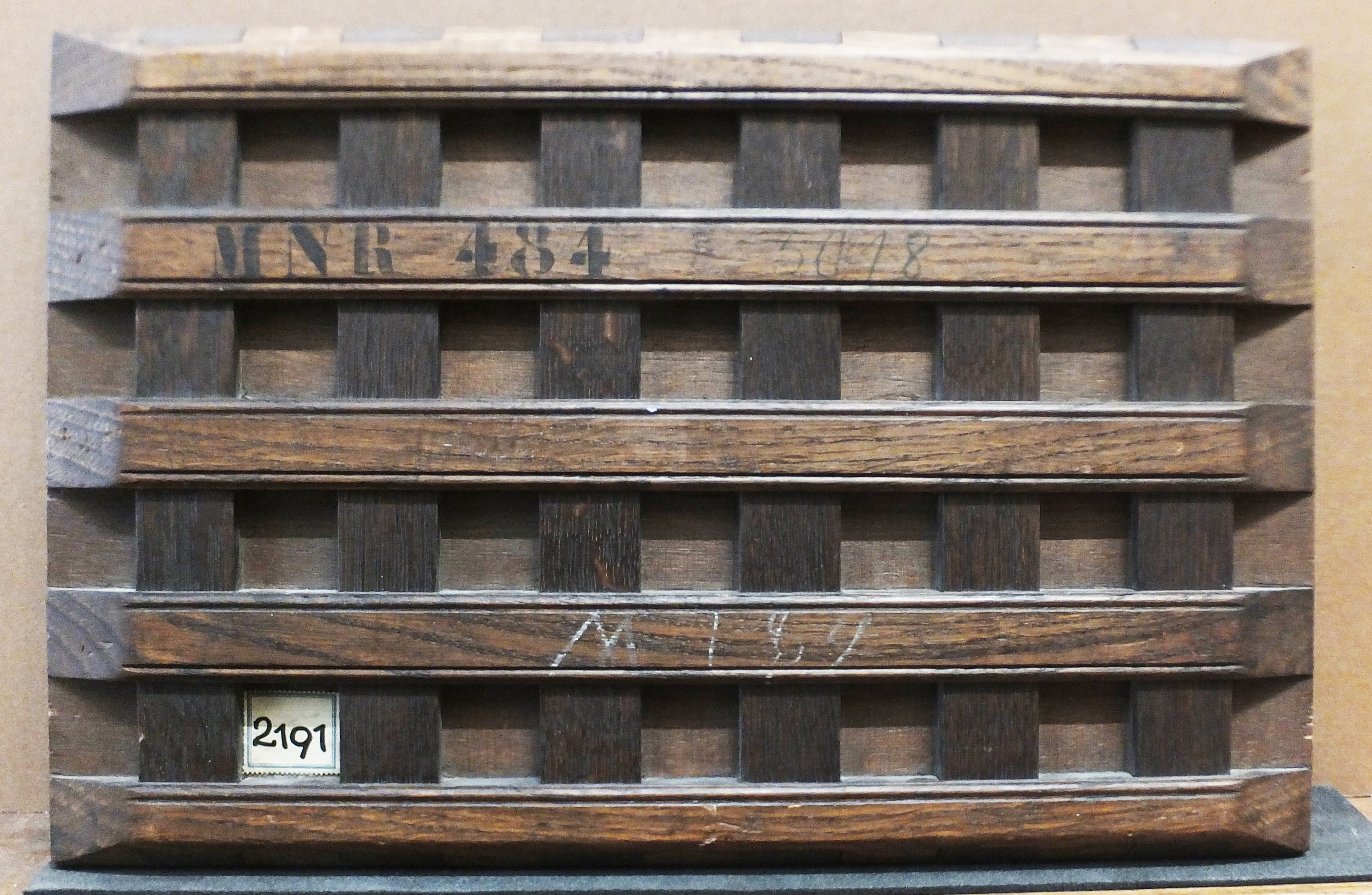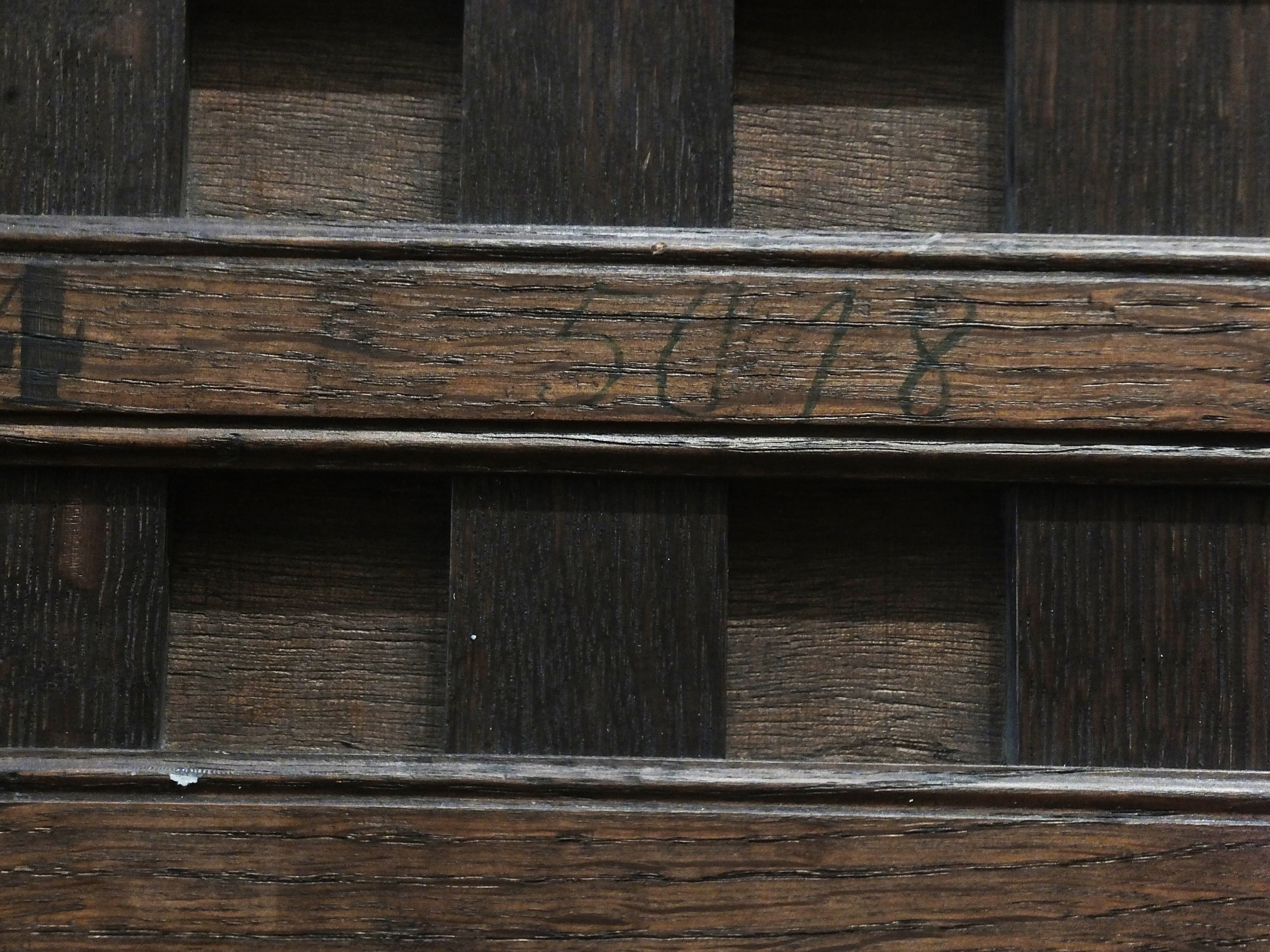Sur les montants : Premier à partir du haut : rien ; deuxième, au pochoir "MNR 484", au crayon "5018" ; au troisième , traces d'inscriptions en rouge ; au quatrième, à la craie blanche "M 189".