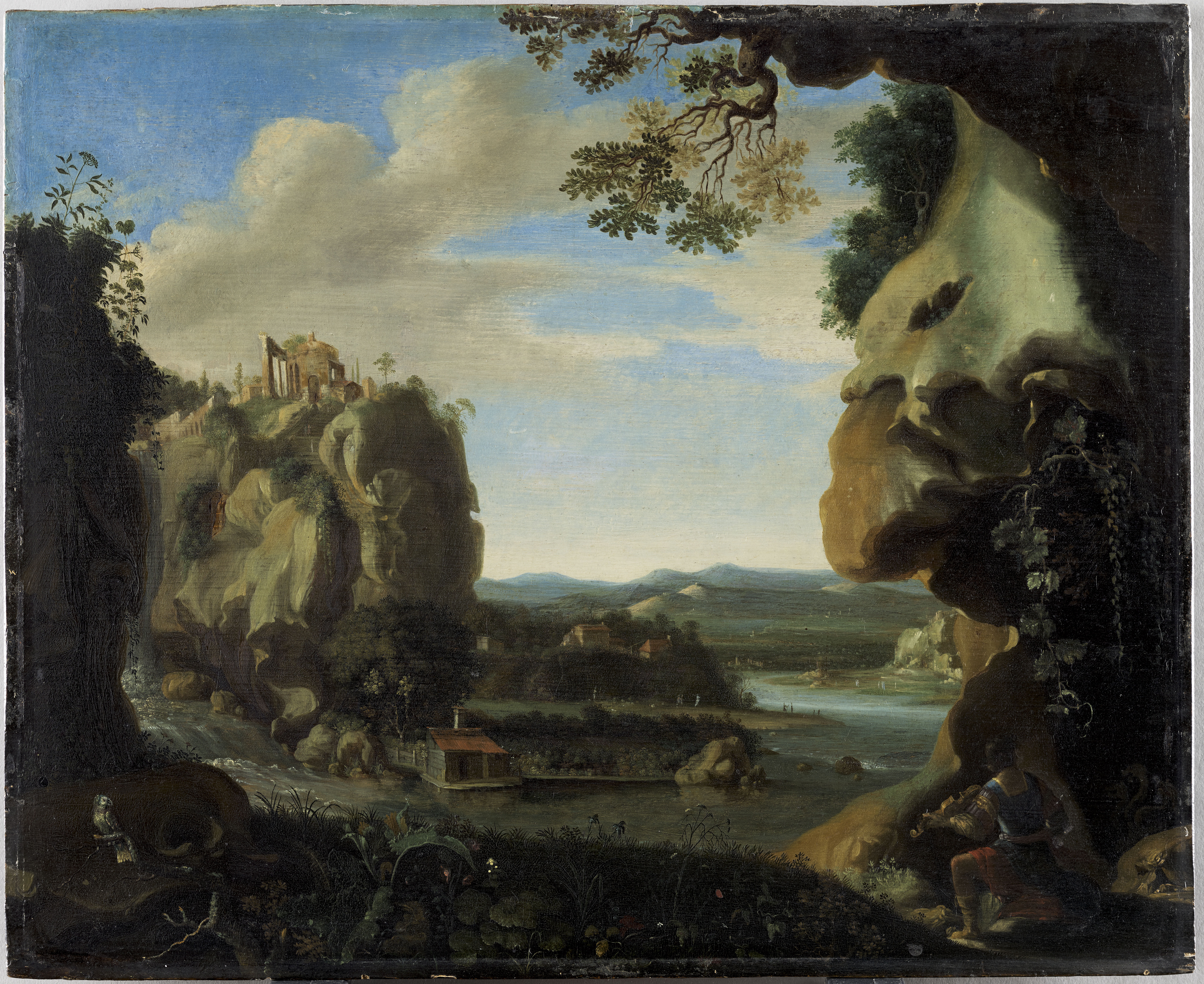 scène mythologique (Orphée, violon) ; paysage (rocher, pré, fleur, colline, cours d'eau, maison) ; perroquet