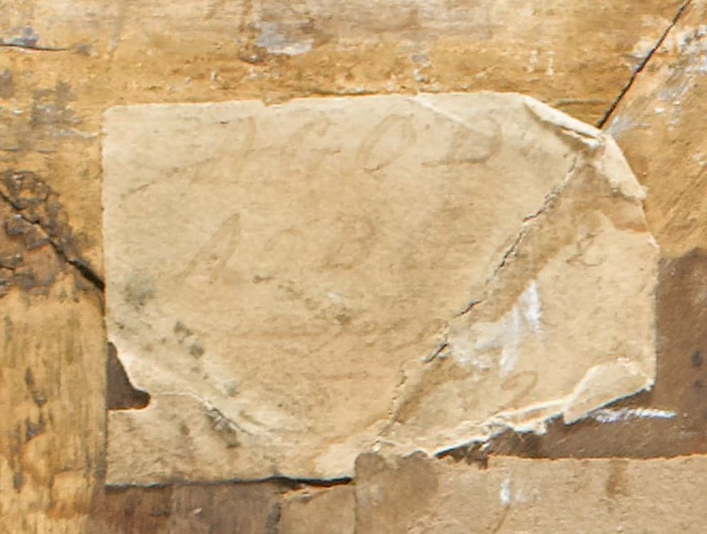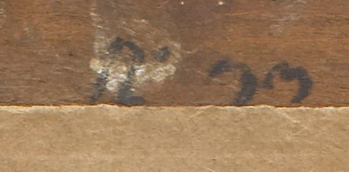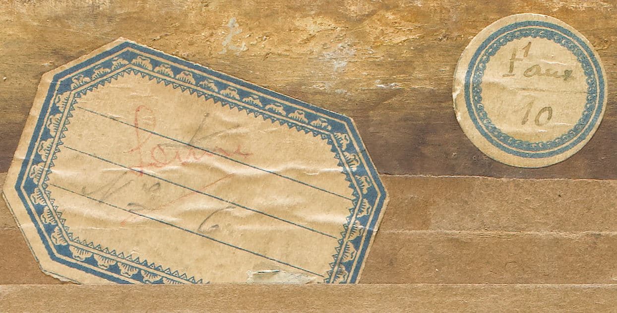 -Sur le cadre : Étiquette rectangulaire à coins coupés bordée de palmettes « Louvre/n° 6 » ; étiquette ronde bordée d'oves bleues « Faux/10 » ; étiquette ronde « K/13/14 » ; étiquette rectangulaire coupée bordée de bleu « MNR 524/10 [au crayon de graphite]/Toulouse-Lautrec/Pt de Coquelin » ; inscription à la craie blanche illisible ; étiquette rectangulaire à l'encre en partie effacée « AGOD./AOBG ...2/.../... 32 » ; inscription en noir « n° 33 [ou 22 ou 32 ou 23] » ; traces d'étiquettes.