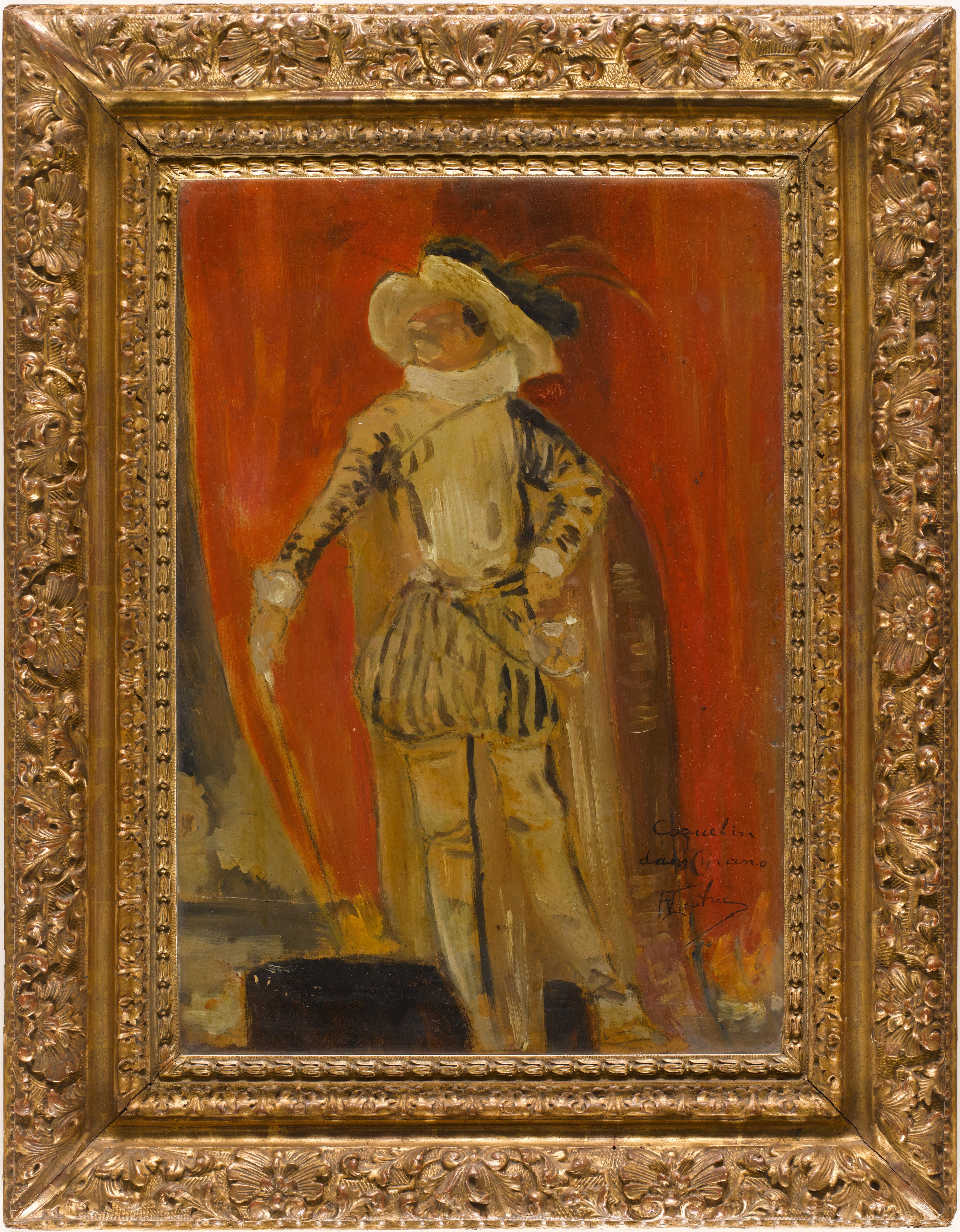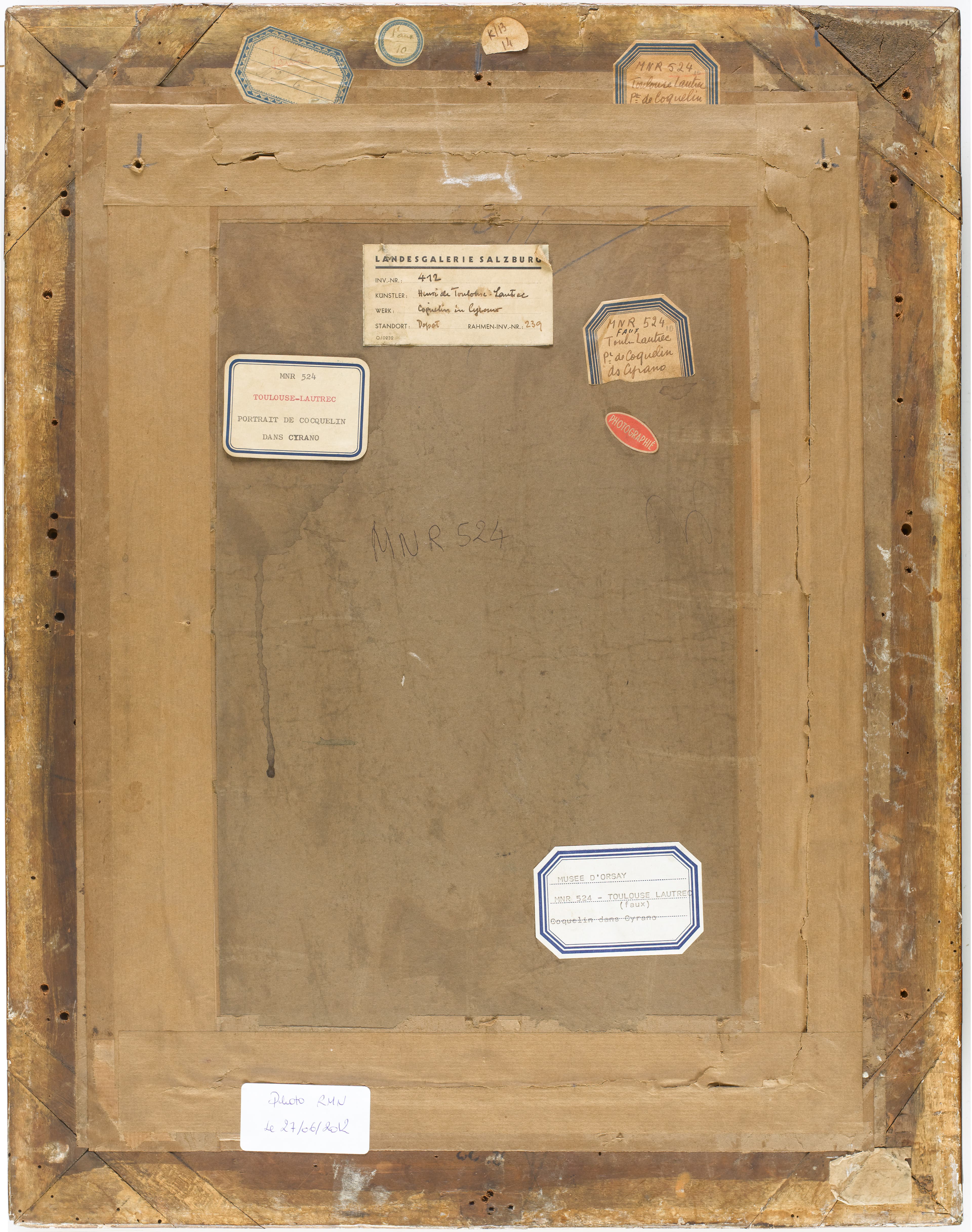 -Sur le montage : Étiquette rouge ovale « Photographié » ; étiquette rectangulaire « Landesgalerie Salzburg/Inv.-Nr.412/Künstler : Henri de Toulouse-Lautrec/Werk : Coquelin in Cyrano/Standort : Depot/Rahmen-Inv.-Nr. : 239/ Q.0232 », collée sur une étiquette de même taille ; inscription en dessous non lisible à la craie bleue « 61/... ? » ; étiquette rectangulaire coupée à coins coupés bordée de bleu « MNR 524/FAUX/10 [au crayon de graphite]/Toul.-Lautrec/Pt de Coquelin/da Cyrano » ; étiquette rectangulaire à coins arrondis bordée de bleu « MNR 524/Toulouse-Lautrec/Portrait de Coquelin/dans Cyrano » ; au crayon : « MNR 524 » ; au crayon « 31 » ? ; étiquette rectangulaire à coins coupés bordée de bleu « Musée d'Orsay/MNR 524-Toulouse-Lautrec/(Faux)/Coquelin dans Cyrano » ; étiquette rectangulaire « Photo RMN/Le 26.06.2012 ».