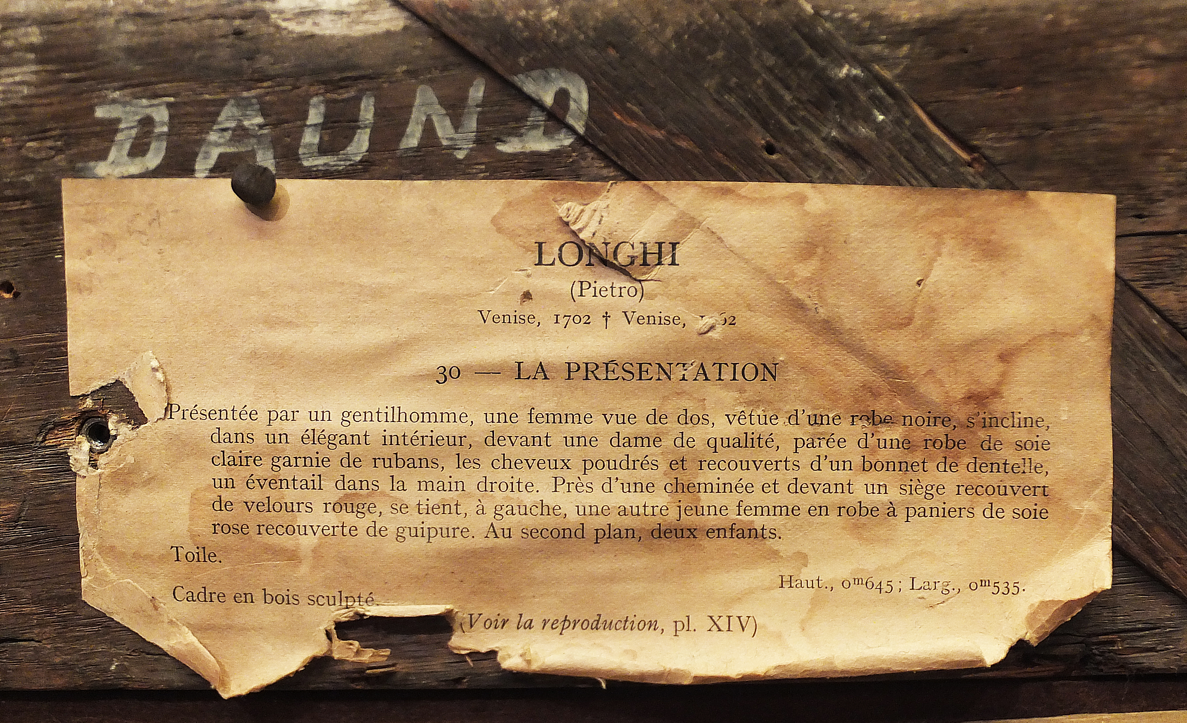 Sur le montant supérieur : Étiquette rectangulaire à coins ronds et liseré bleu "MNR 562/Longhi/La Présentation" ; étiquette rectangulaire "MNR 562/Longhi Pietro/La Présentation/Italie/Hauteur : 0,39 Largeur 0,32 (sic)" ; étiquette rectangulaire "Réunion des musées nationaux/Titre de l’œuvre : La Présentation/ Propriétaire : Louvre/N° du catalogue : 114" ; étiquette rectangulaire "Comune di Venezia/Dal Ricci al Tiepolo/I pittori di figura del settecento a Venezia/Palazzo ducale /93" ; à la peinture blanche ".8481" ; au crayon "KH8 (ou 3?)" ; étiquette rectangulaire de vente du 20 novembre 1941 (lot 30) ; étiquette rectangulaire entourée d'un ruban rouge "Lebrun/encadreur depuis 1847/...[scu]lptés/... décorations/155, faub.St Honoré/Paris BAL.14-66/N° 8.487.. (?)" ; à la peinture blanche "DAUND... (?)".