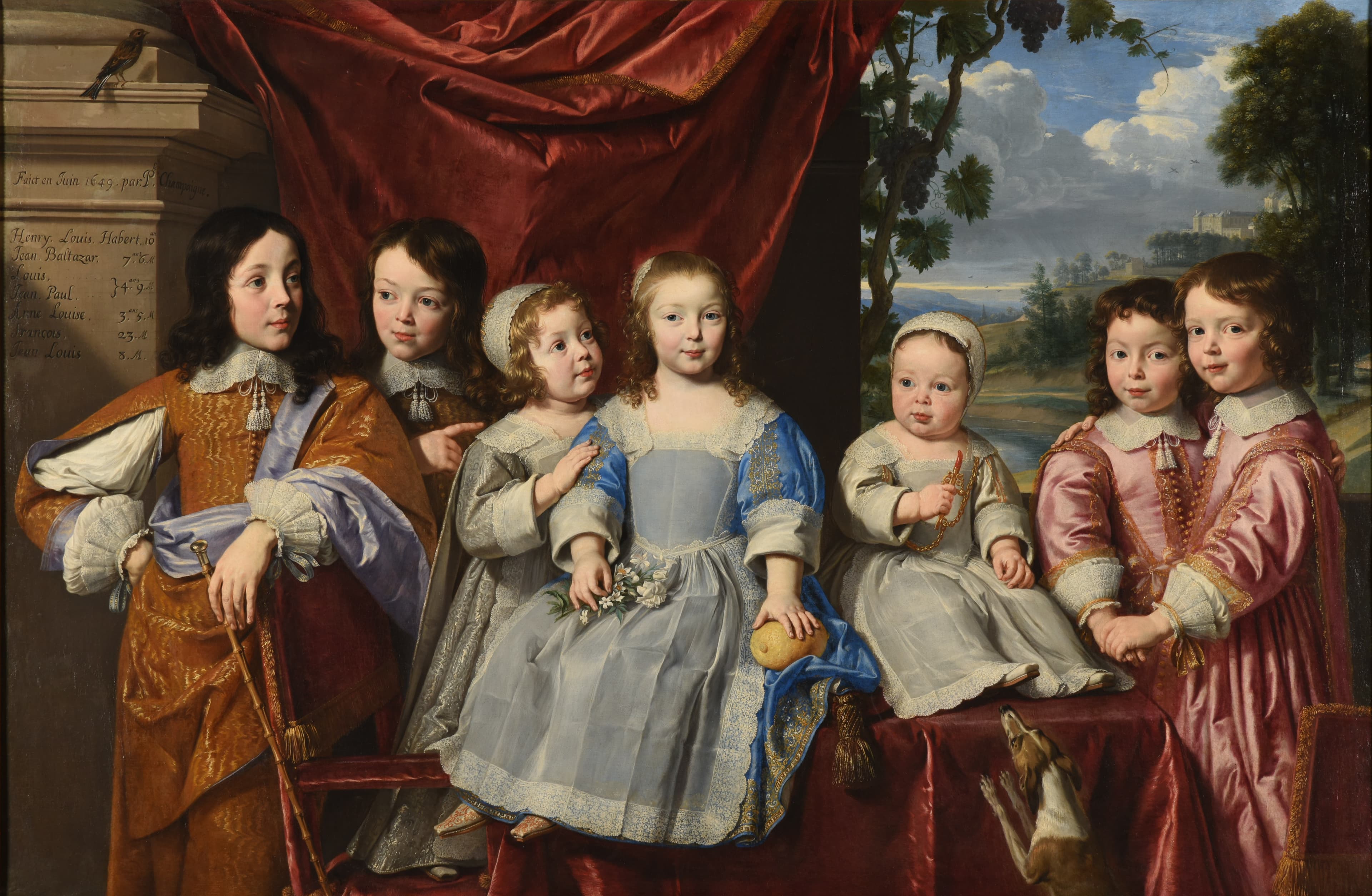 portrait collectif (Montmor, enfant, en pied, de face, robe, habit, base, draperie) ; fond de paysage (feuillu)