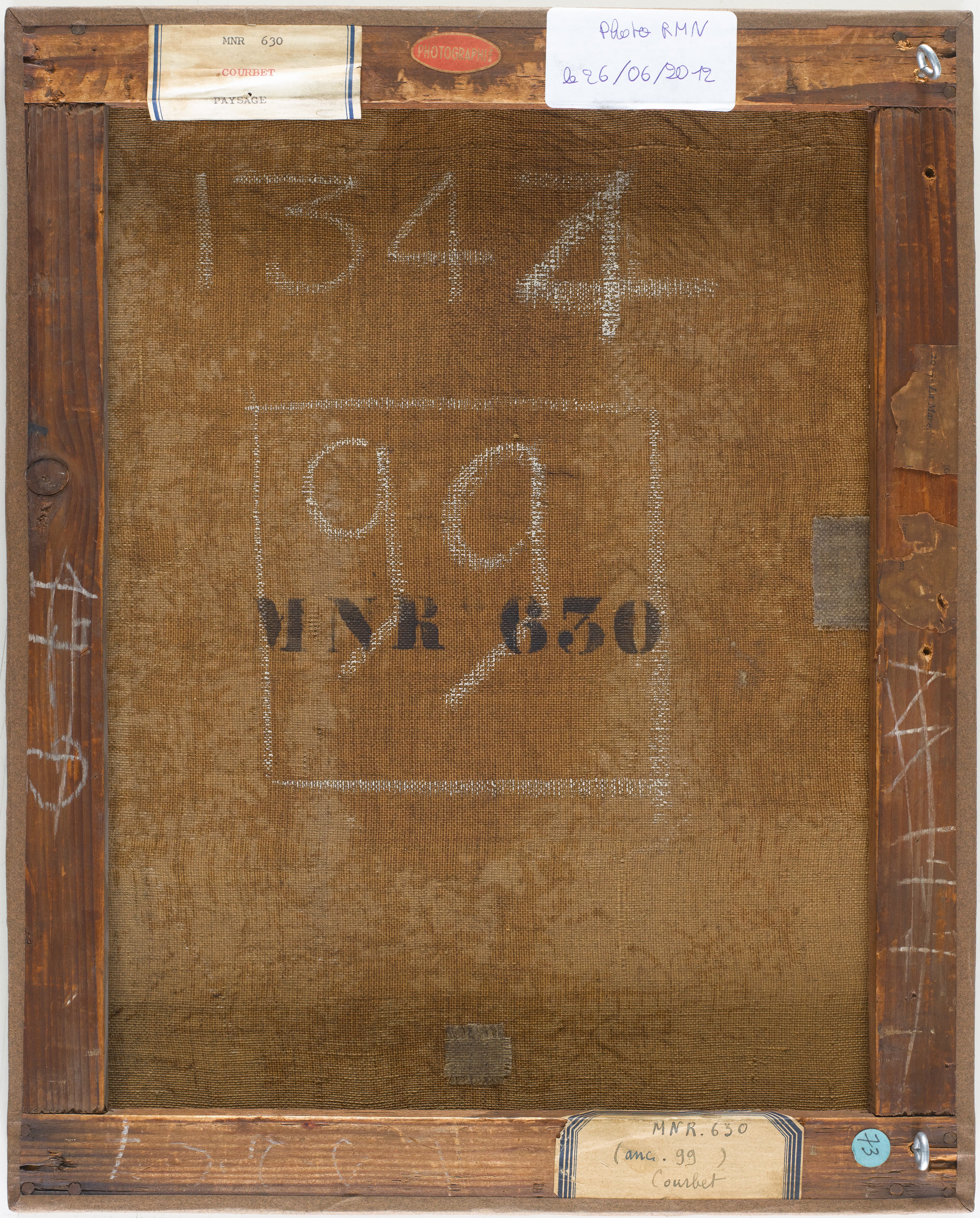 -Montant gauche : Étiquette rectangulaire blanche bordée de bleu « MNR 630/Courbet/Paysage » ; étiquette ovale rouge « Photographié » ; étiquette rectangulaire à coins arrondis « Photo RMN/le 26/06/2012 ».