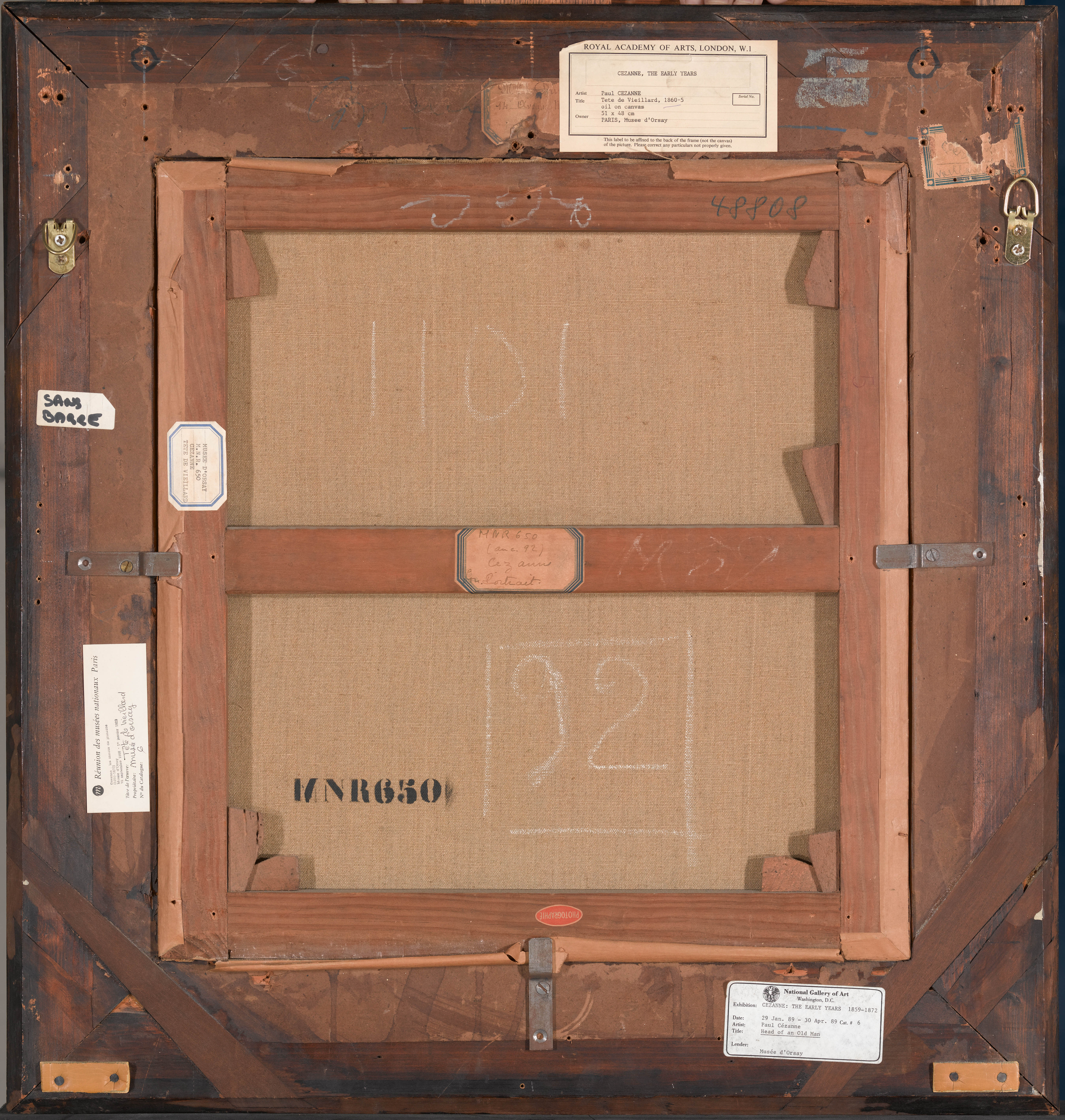 -Montant inférieur : Étiquette rectangulaire bordée de noir « National Gallery of Art/Washington D.C./Exhibition : Cézanne : The Early Years 1859-1872/Date : 29-Jan. 89 - 30 Apr. 89 Cat 6/Artist : Paul Cézanne/ Title : Head of an Old Man/Lender : Musée d'Orsay ».