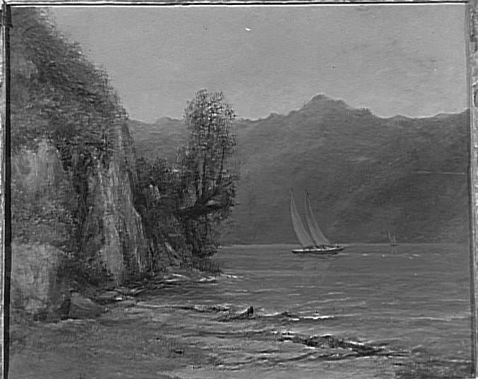 paysage (lac, rive, falaise, bateau à voiles, feuillu)