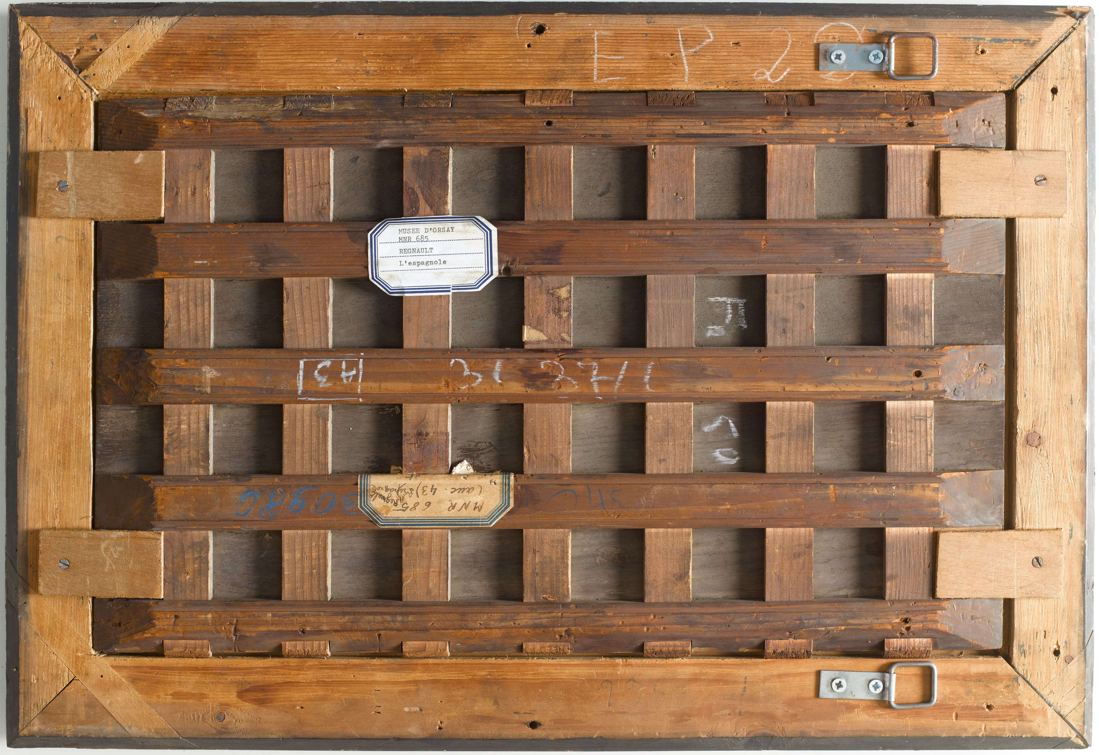 -Quatrième montant à partir de la gauche : A la craie bleue « 371 C » ; étiquette rectangulaire à coins coupés bordée de bleu « MNR 685/(anc. 43)/H.REGNAULT/L'espagnole/[illisible] » ; à la craie bleue « 30980 ».