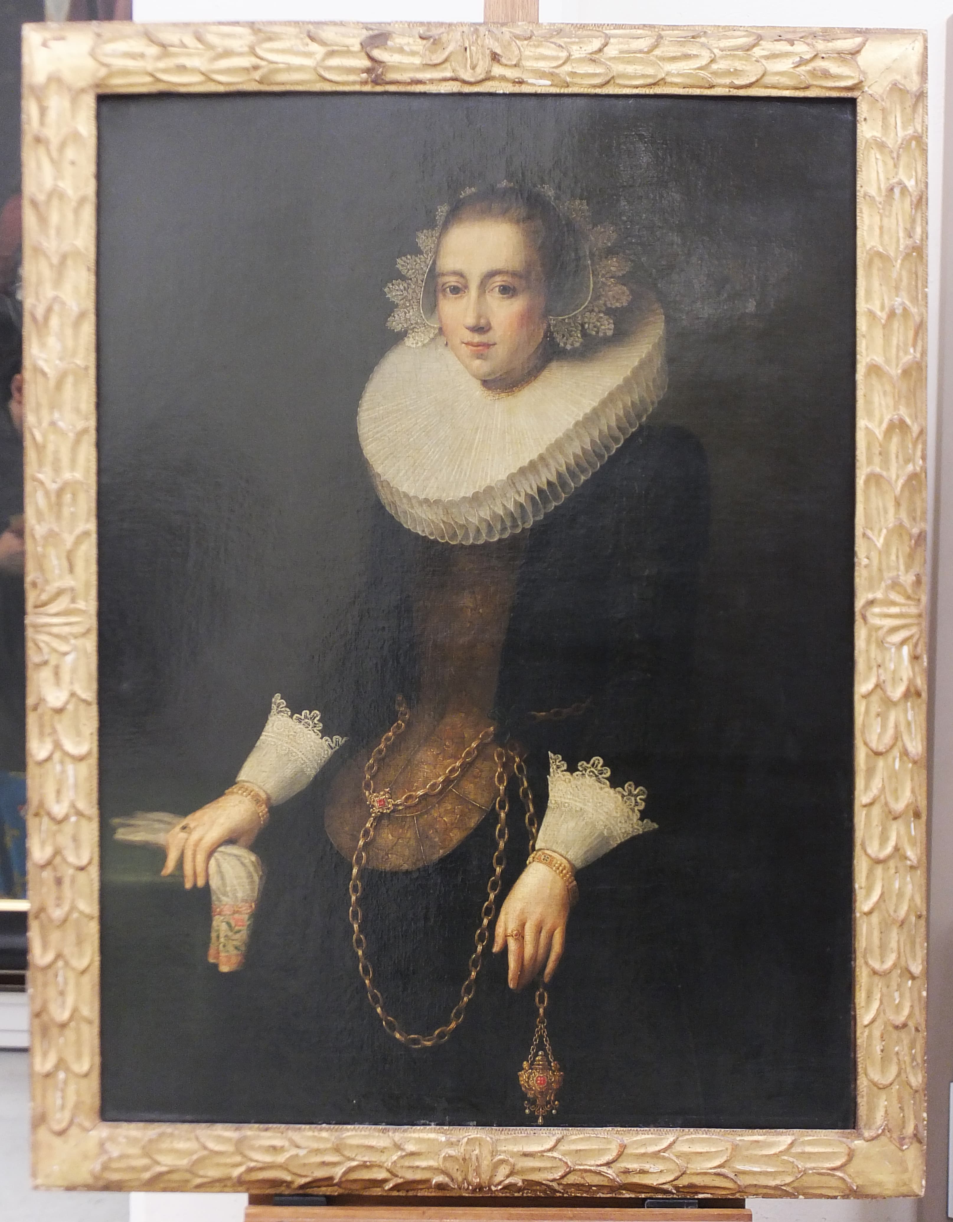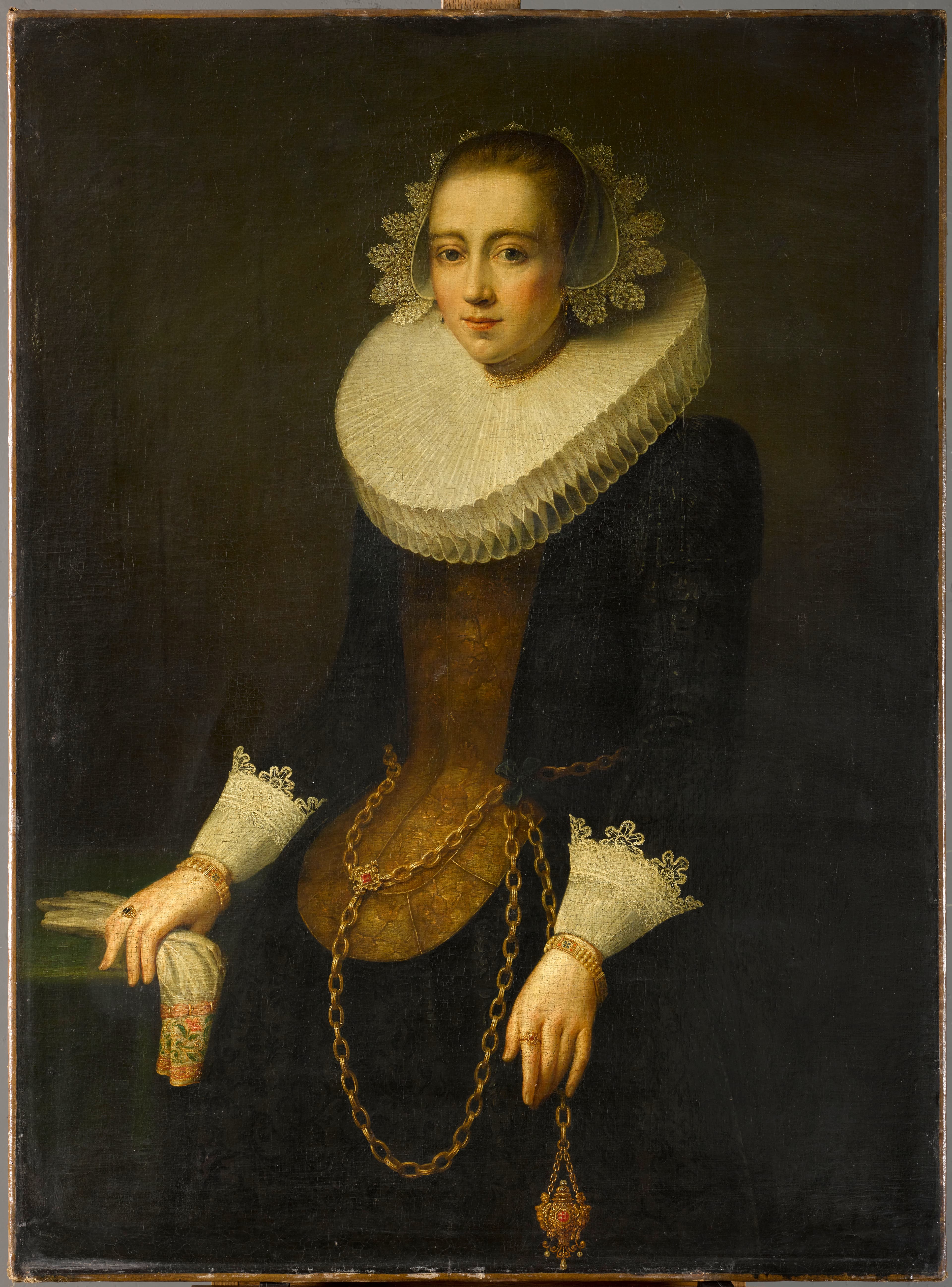 portrait d'inconnu (femme, à mi-corps, de trois-quarts, debout, robe, col, coiffe, dentelle, gant, chaine : orfèvrerie)