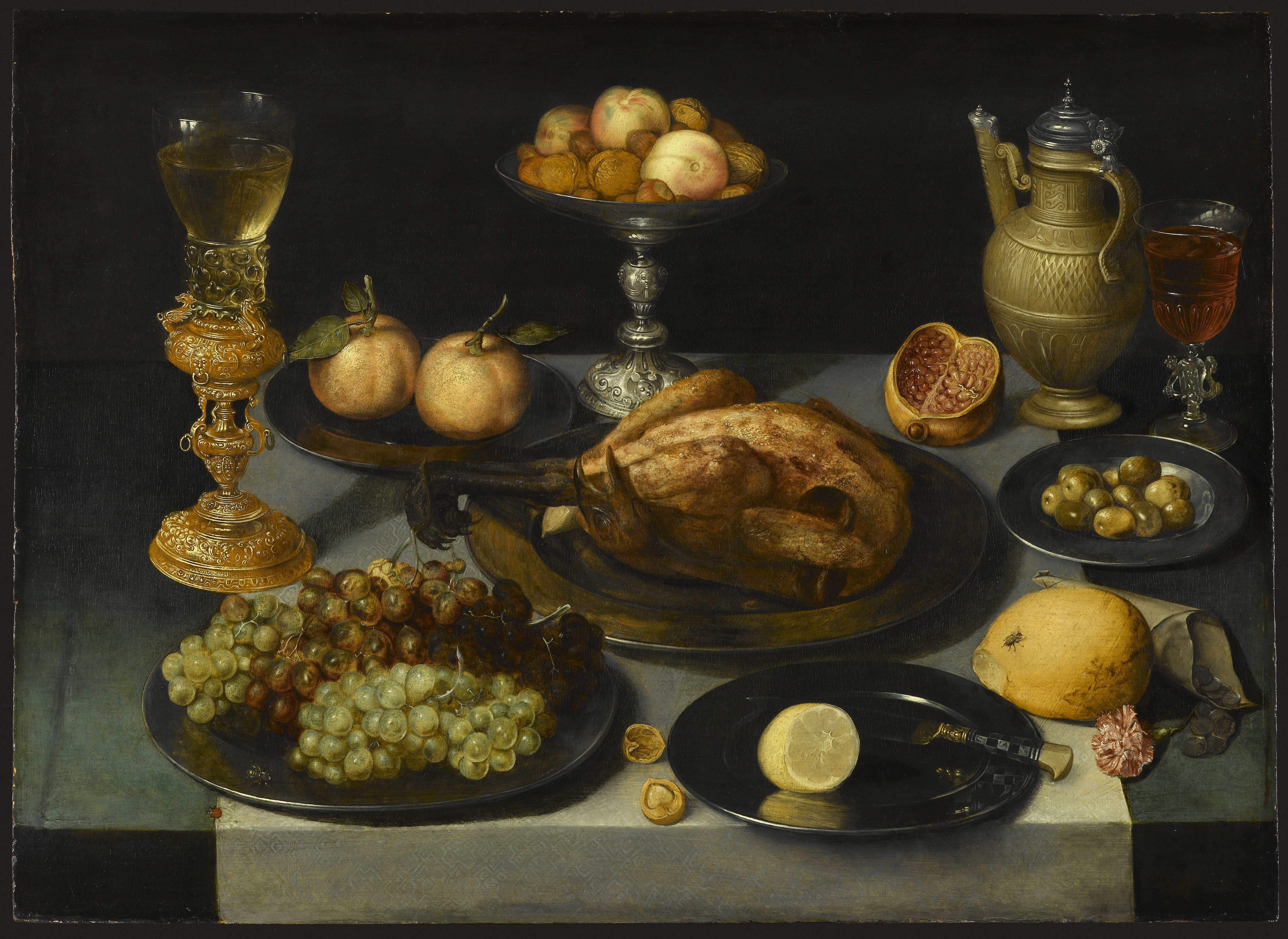 nature morte (table, plat, verre à pied, récipient pour la boisson, verrerie, orfèvrerie, volaille, fruit : noix, grenade fruit, raisin, pomme, olive)
