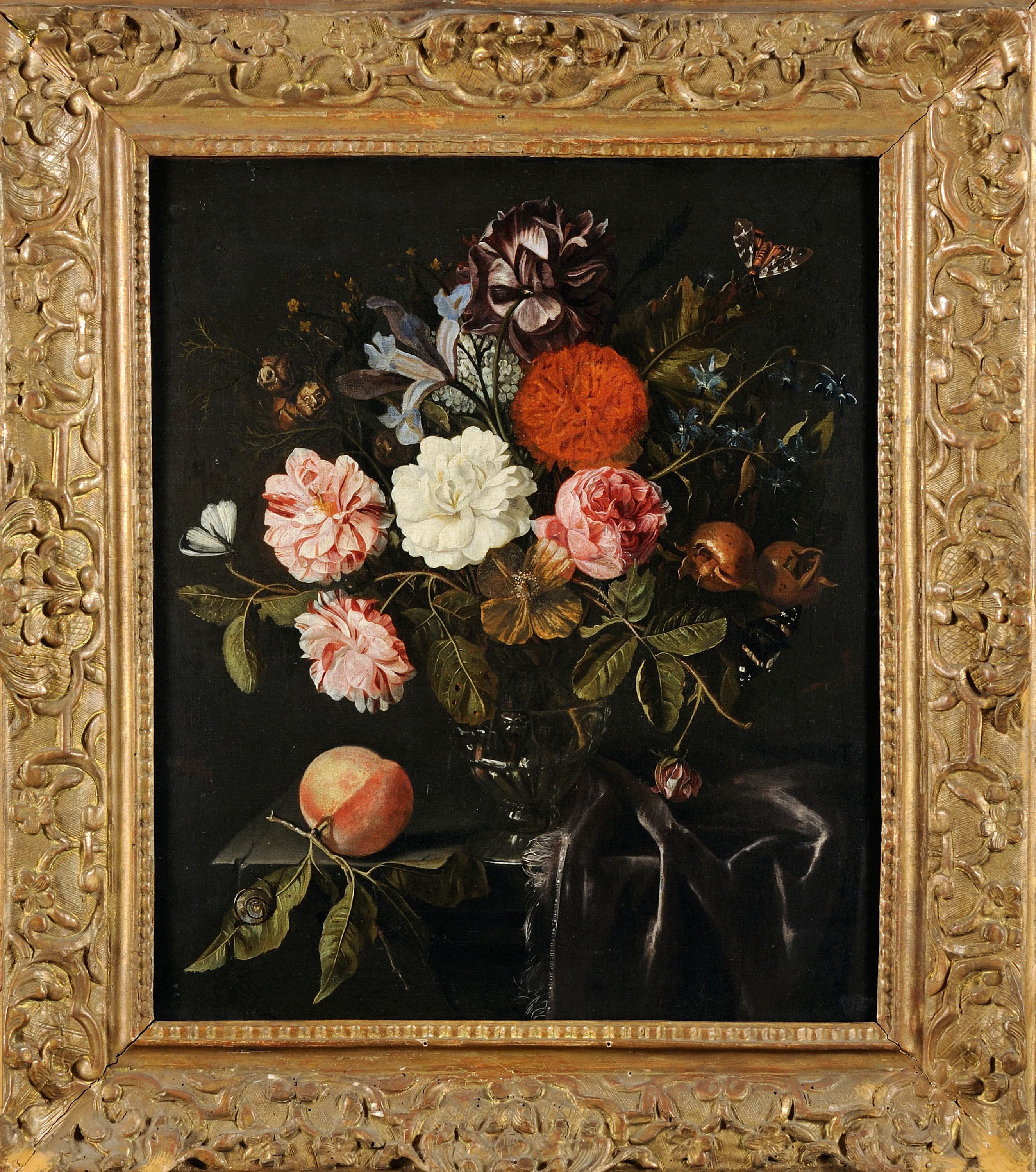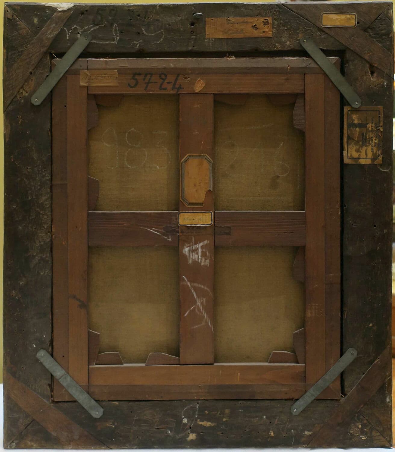-Sur le châssis : A la craie blanche "57-2-4" ; en noir "57-2-4" ; à la craie rose "[DY]K 983" ; étiquette rectangulaire à listel bleu "Ets/Pottier/Emballage-Transports/14, rue Gaillon, Paris-2°/...Bo... (?)/.../(au pochoir) 17" ; étiquette rectangulaire à coins arrondis et listel bleu, illisible "Fleurs (?)" ; étiquette rectangulaire à coins arrondis et listel bleu "57-2-4" ; étiquette rectangulaire à coins coupés et listel bleu, déchirée "MNR 737/(anc. 246)/Heem/Fleurs" ; papier collé, imprimé "Davis de Heem./ 36 (?). Vase avec fleurs posé sur un socle. H. 53. L.45" ; papier collé "Eigentum/Wüster" et au crayon "CC/9241 (?)" ; étiquette ovale rouge "Photographié" ; papier collé en partie déchiré "Ad.(?) Wüster".