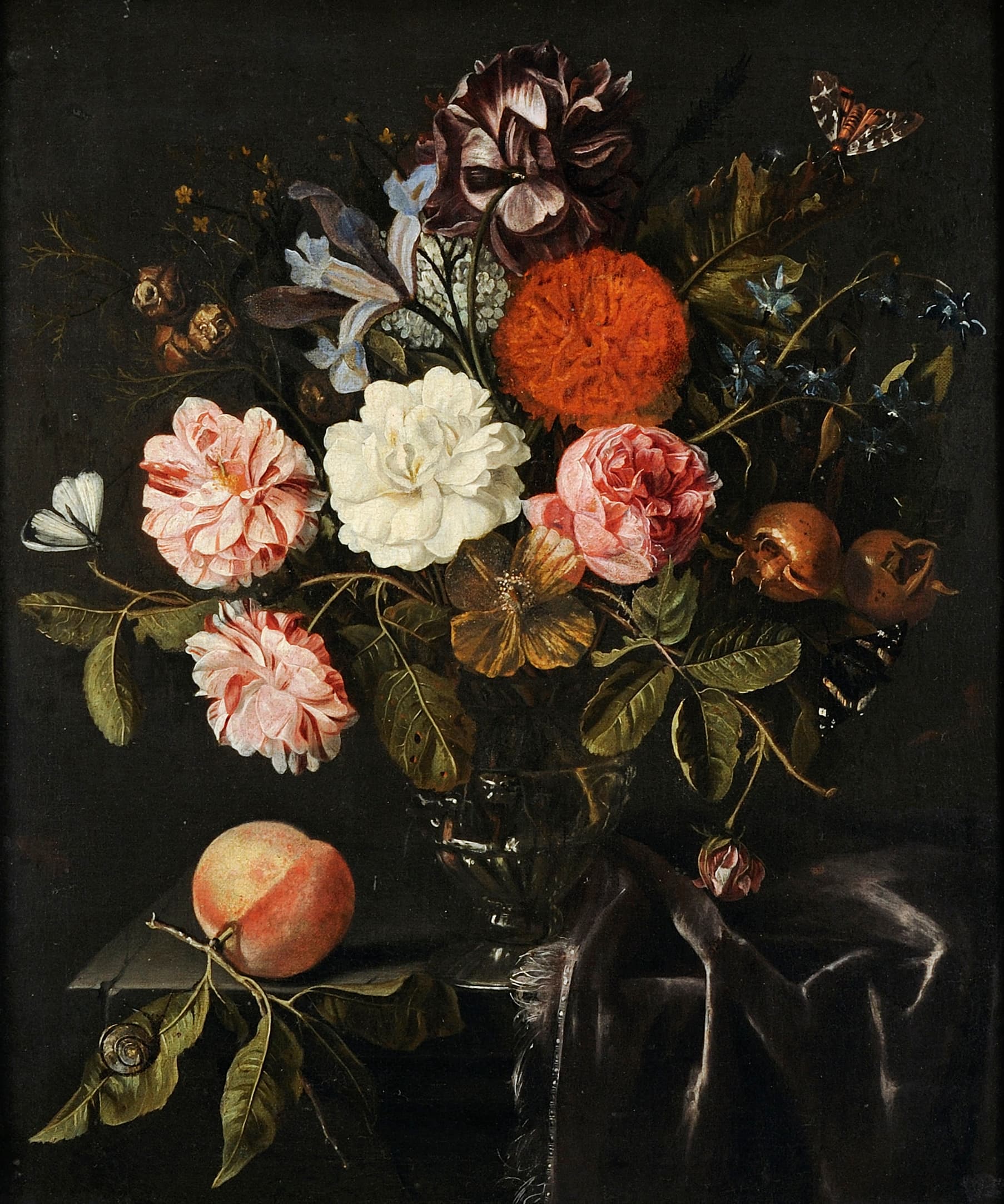 nature morte (bouquet, vase, oeillet, rose, tulipe, papillon, pêche fruit, effet de tissu)