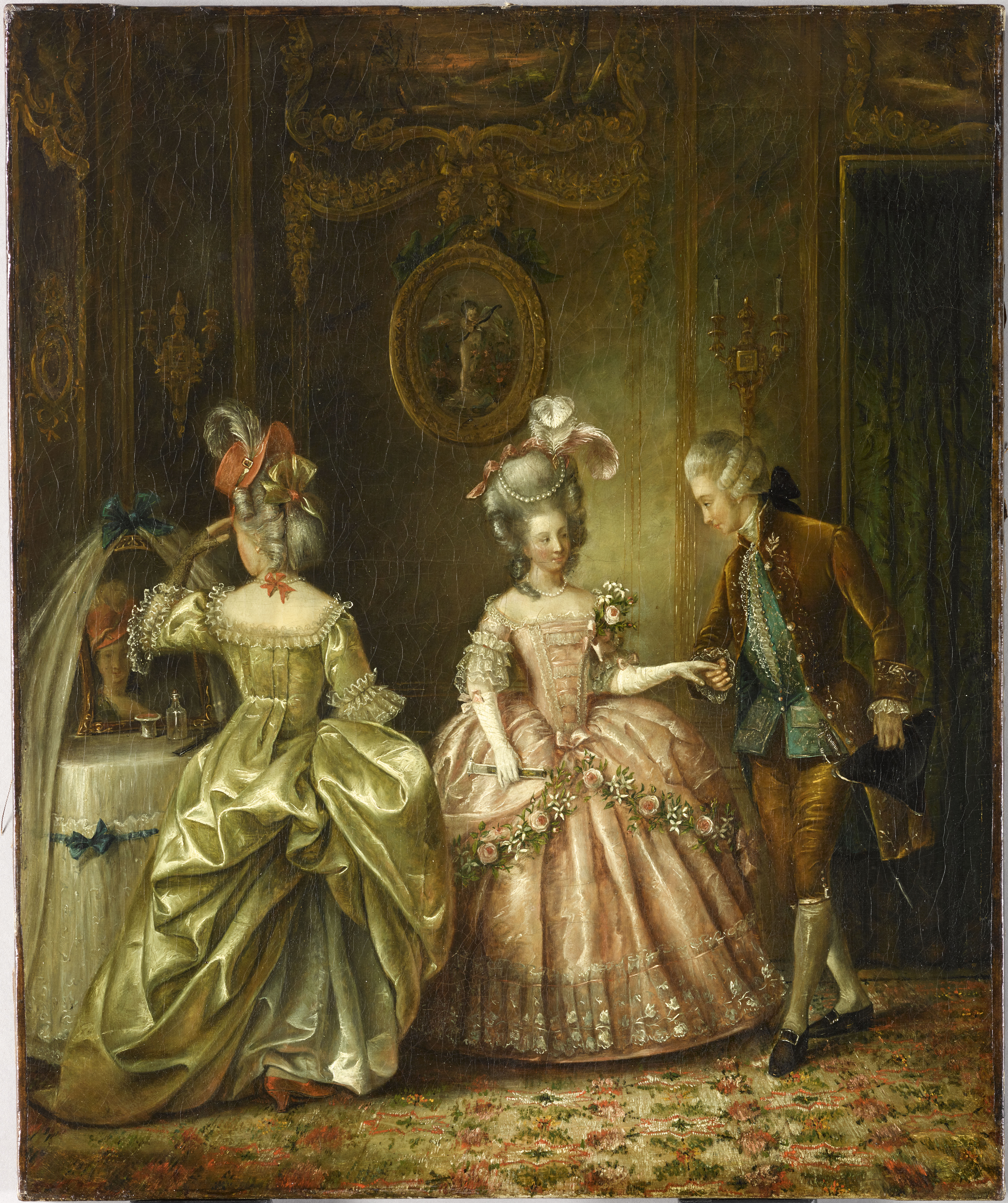 scène (femme, robe : bal, coiffure, homme, révérence, intérieur, meuble : maquillage, miroir)