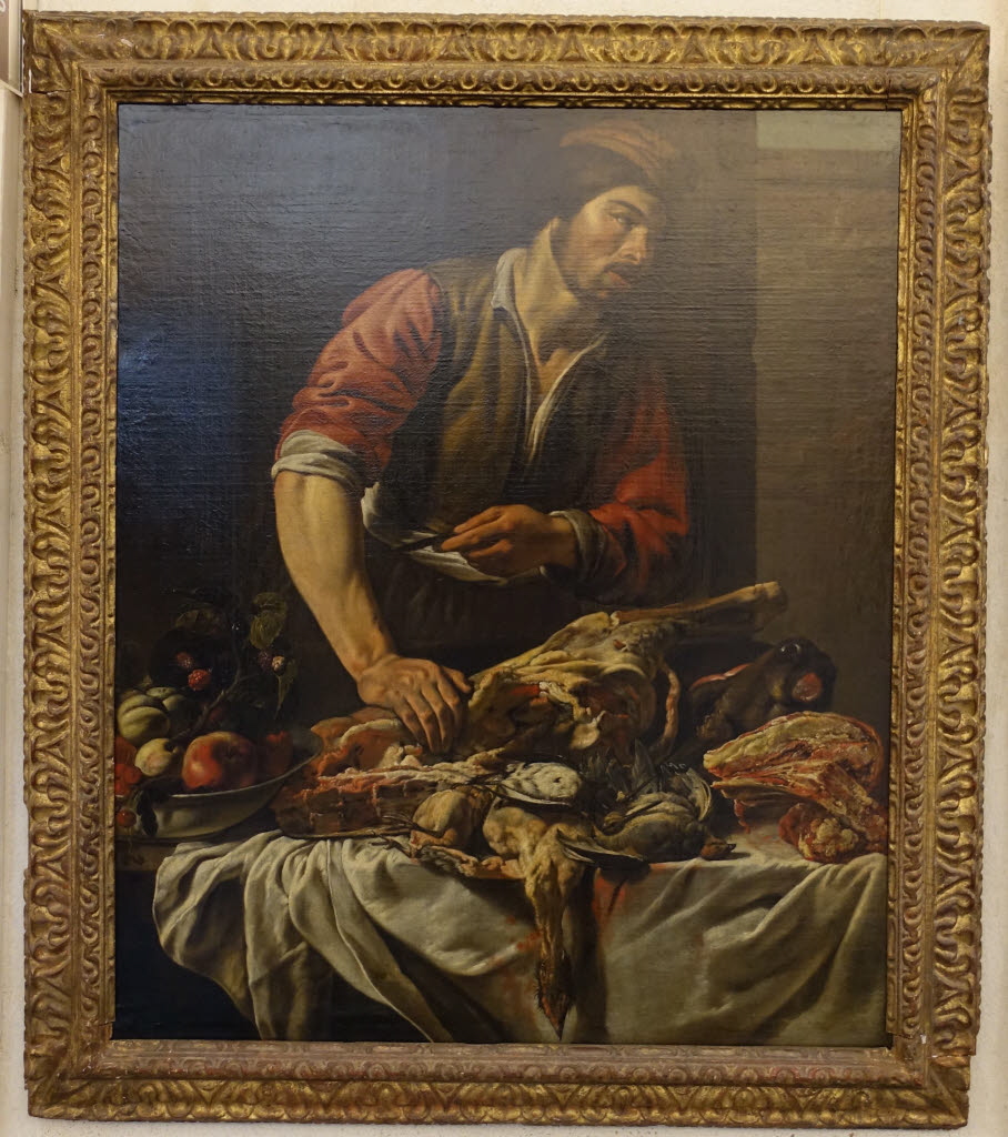 scène (boucher, échoppe, préparation des aliments : viande, gibier à plume, fruit, couteau)