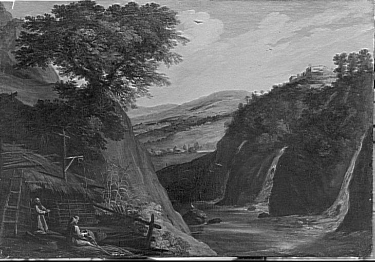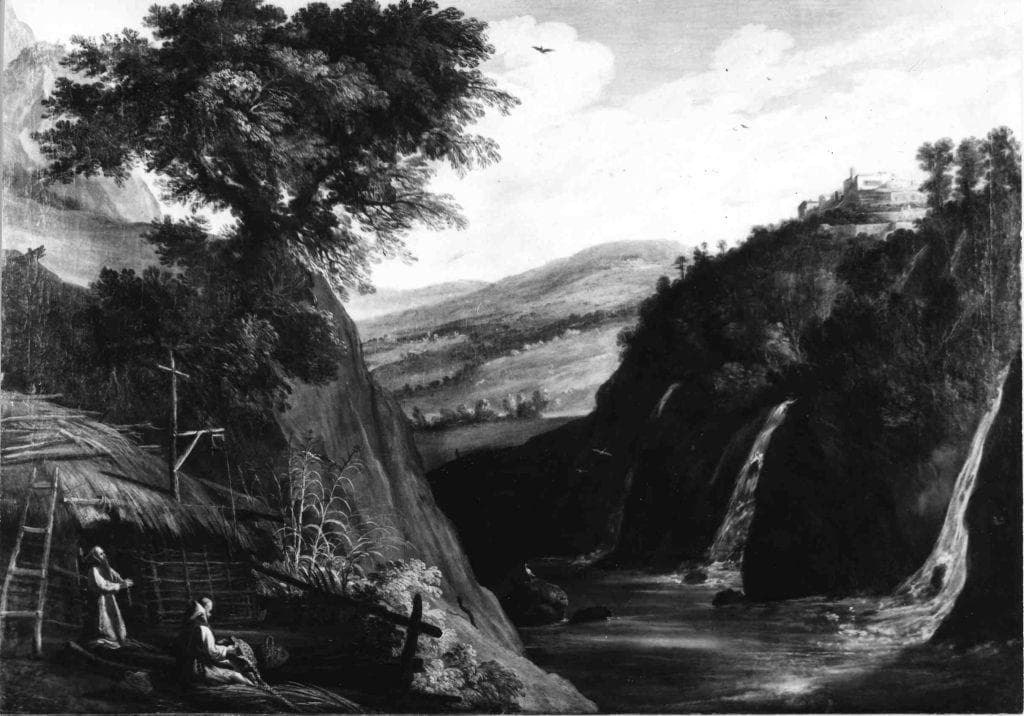 paysage (falaise, montagne, rivière, chute d'eau, feuillu, moine, cabane)