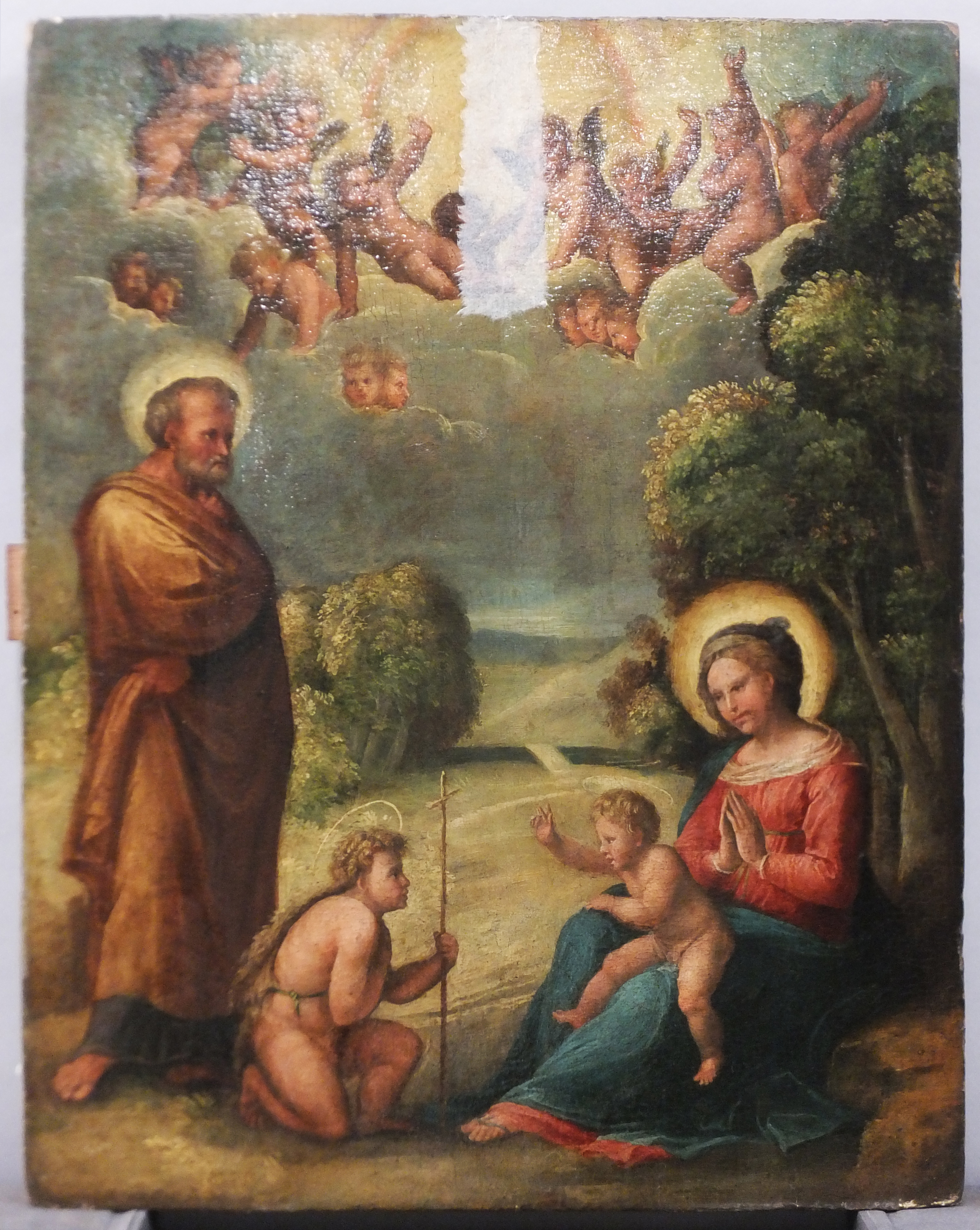 scène biblique (Sainte Famille, Vierge, assis, de trois-quarts, Enfant Jésus : nu, assis, de profil, bénédiction, saint Jean-Baptiste : enfant, agenouillé, de profil, saint Joseph, en pied, de trois-quarts, ange, dans les airs, nuée, angelot) ; fond de paysage (feuillu)
