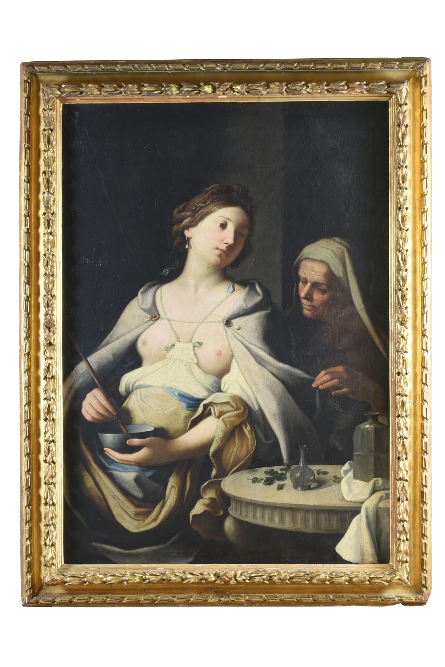 scène mythologique (Circé, femme, vieille, nudité : sein, préparation des aliments, magie, table, bouteille)