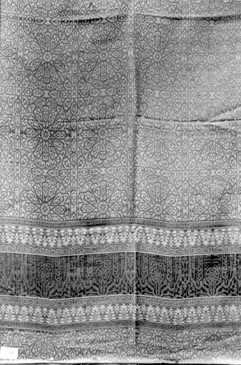 Décor de polygones étoilés dans un cadre géométrique ; à l'une des extrémités de la bande d'étoffe : bordure composée de (72) frises de largeur différente : deux étoiles encadrant une autre décorée de motifs en créneaux. Au milieu large frise 0,69 cm en bleu saphir pseudo-épigraphie sur fond vieux rose (description donnée par Jean David-Weill).