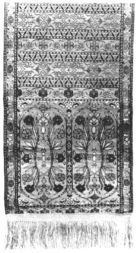 Longue ceinture terminée par des franges de fils d'or. A chaque extrémité, deux médaillons à motif floral encadrent le décor composé de bandes géométriques et végétales sur toute la longueur. Soie, taqueté façonné de 4 lats de lancé de soie filé de lamelles d'or frisé ; frange rajoutée de soie filée de lamelles d'or frisé.