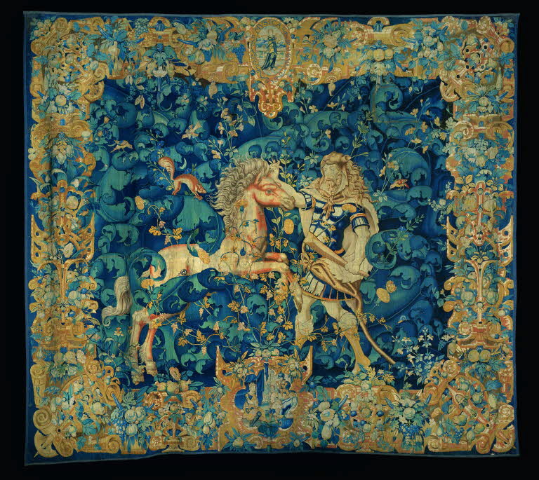 Hercule tourné vers la gauche, tenant sa massue de la main gauche, et revêtu de la peau de lion, arrête de la main droite un cheval, allant vers la gauche, dont il tient la crinière. Très large bordure sur fond jaune à motifs de cuirs découpés, fleurs et fruits ; médaillon supérieur : la Musique [MUSICA] ; médaillon inférieur : un roi, deux guerriers et un enfant (David et Salomon ?).