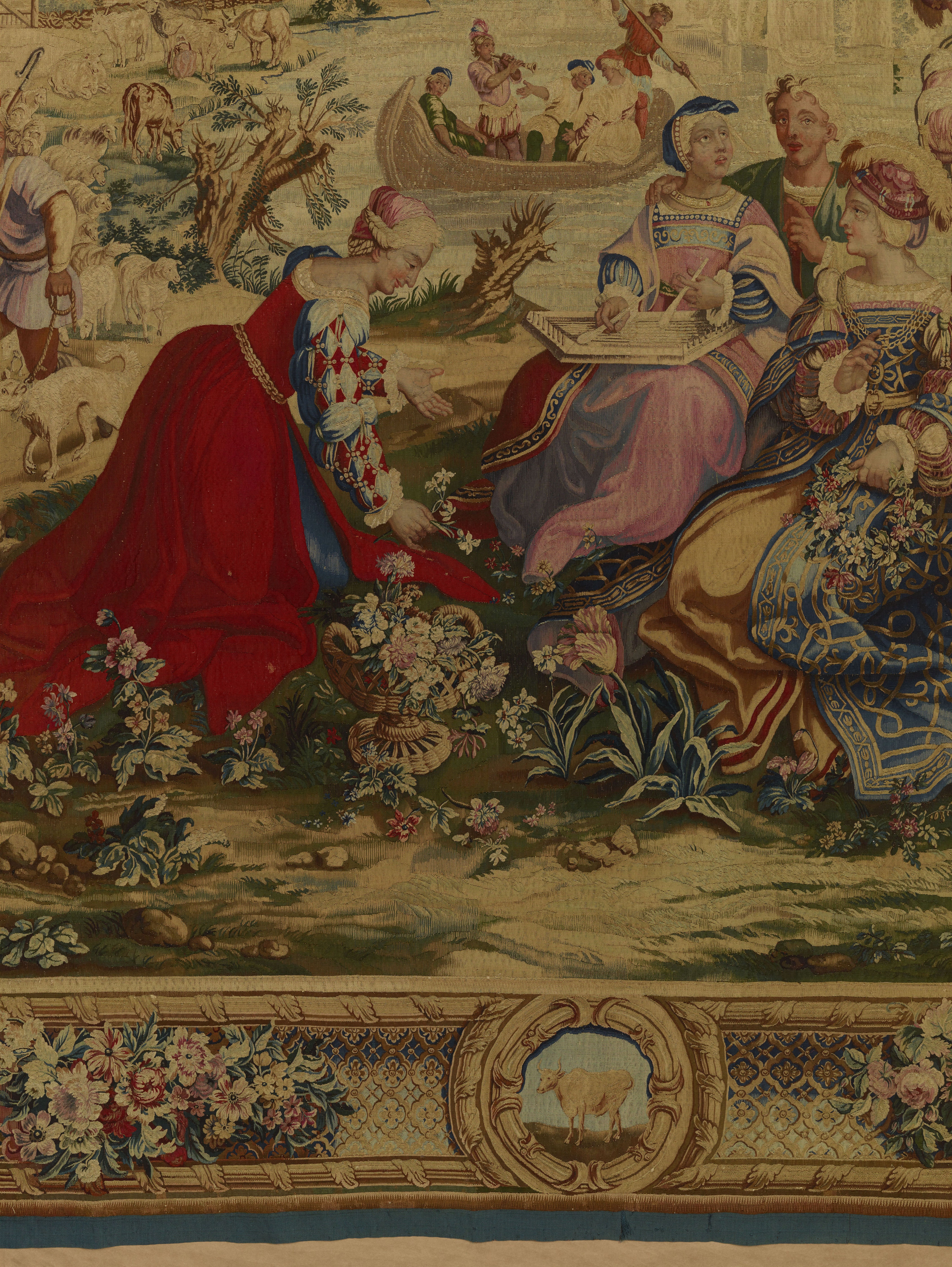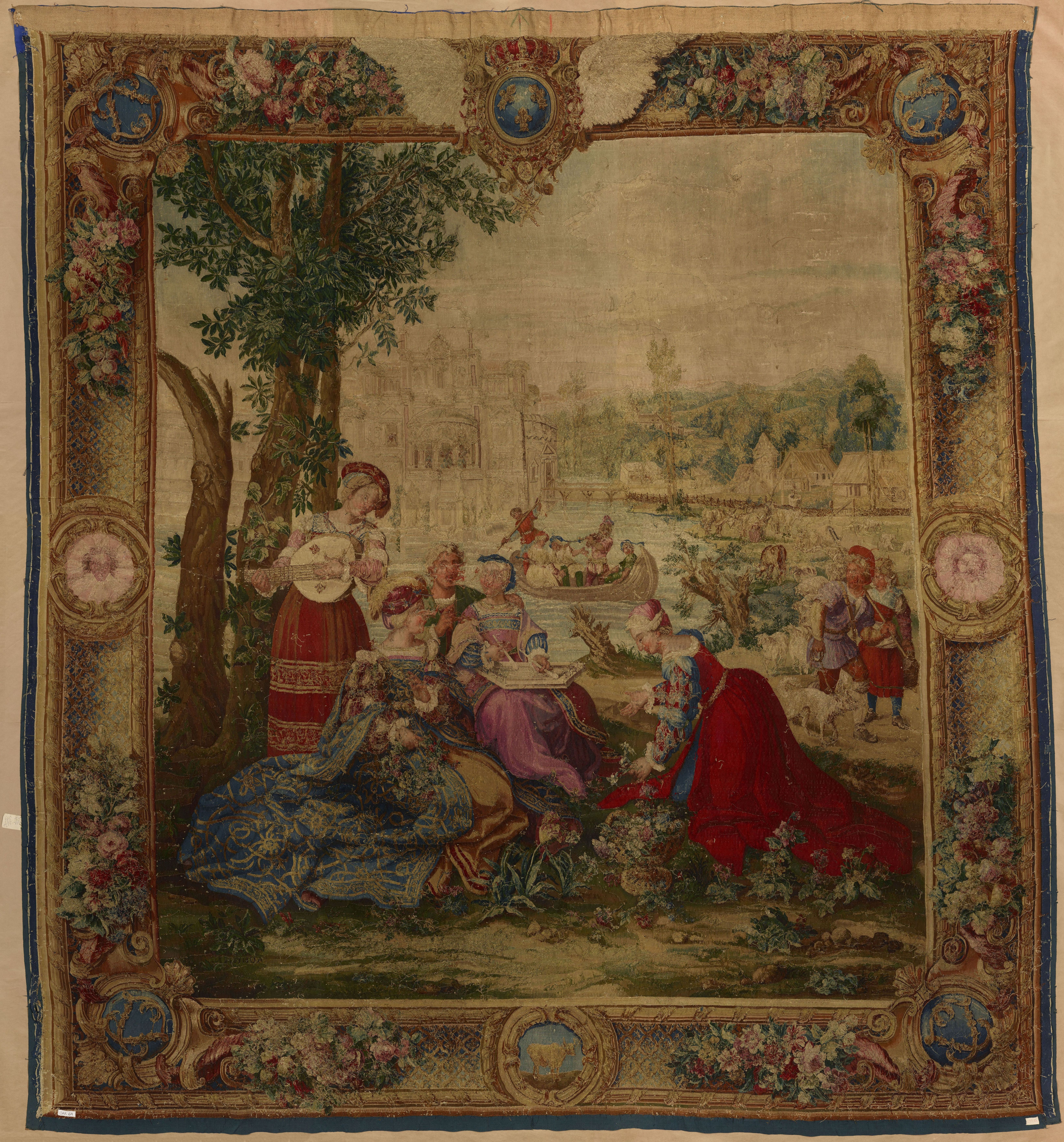 Une dame, assise sur l'herbe, tenant une couronne à la main, se retourne vers la gauche ; une autre femme joue de la cithare, une autre de la mandoline, une quatrième cueille des fleurs ; à gauche du berger, un chien et des moutons. Bordure à losanges jaunes sur fond bleu ; aux angles, quatre cartouches portant les deux L entrelacées ; les armes de France au milieu de la bordure supérieure, au milieu des côtés, mascarons portant des soleils. Neuvième tenture, quatrième bordure.