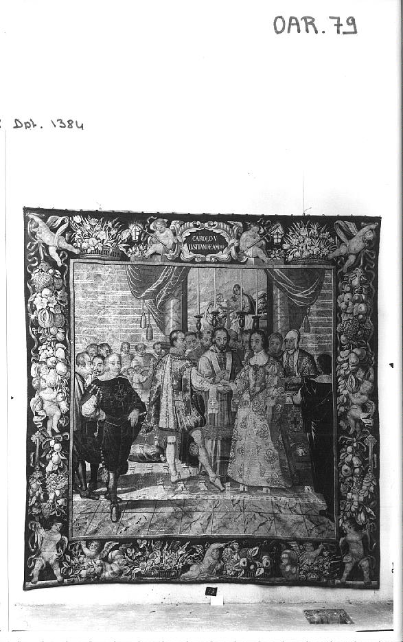 Suite de l'Histoire de Charles Quint (OAR 79-85) ; tapisseries à dominante rouge dont les bordures sont faites d'amours, de corbeilles et de paniers de fleurs, de cornes d'abondance et de guirlandes de fleurs et fruits au naturel ; au milieu de la bordure supérieure, un cartouche à inscription. Le Mariage. Un cardinal, au centre, devant un autel, bénit l'union des deux fiancés qui se donnent la main. Inscription "B" gothique traversant une couronne et broche à tisser.