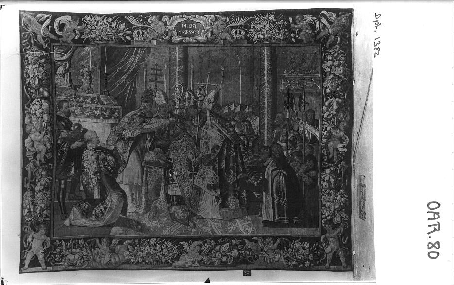 Suite de l'Histoire de Charles Quint (OAR 79-85) ; tapisseries à dominante rouge dont les bordures sont faites d'amours, de corbeilles et de paniers de fleurs, de cornes d'abondance et de guirlandes de fleurs et fruits au naturel ; au milieu de la bordure supérieure, un cartouche à inscription.
