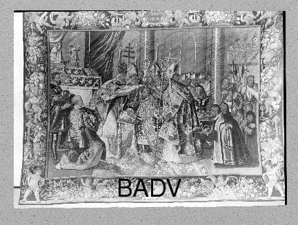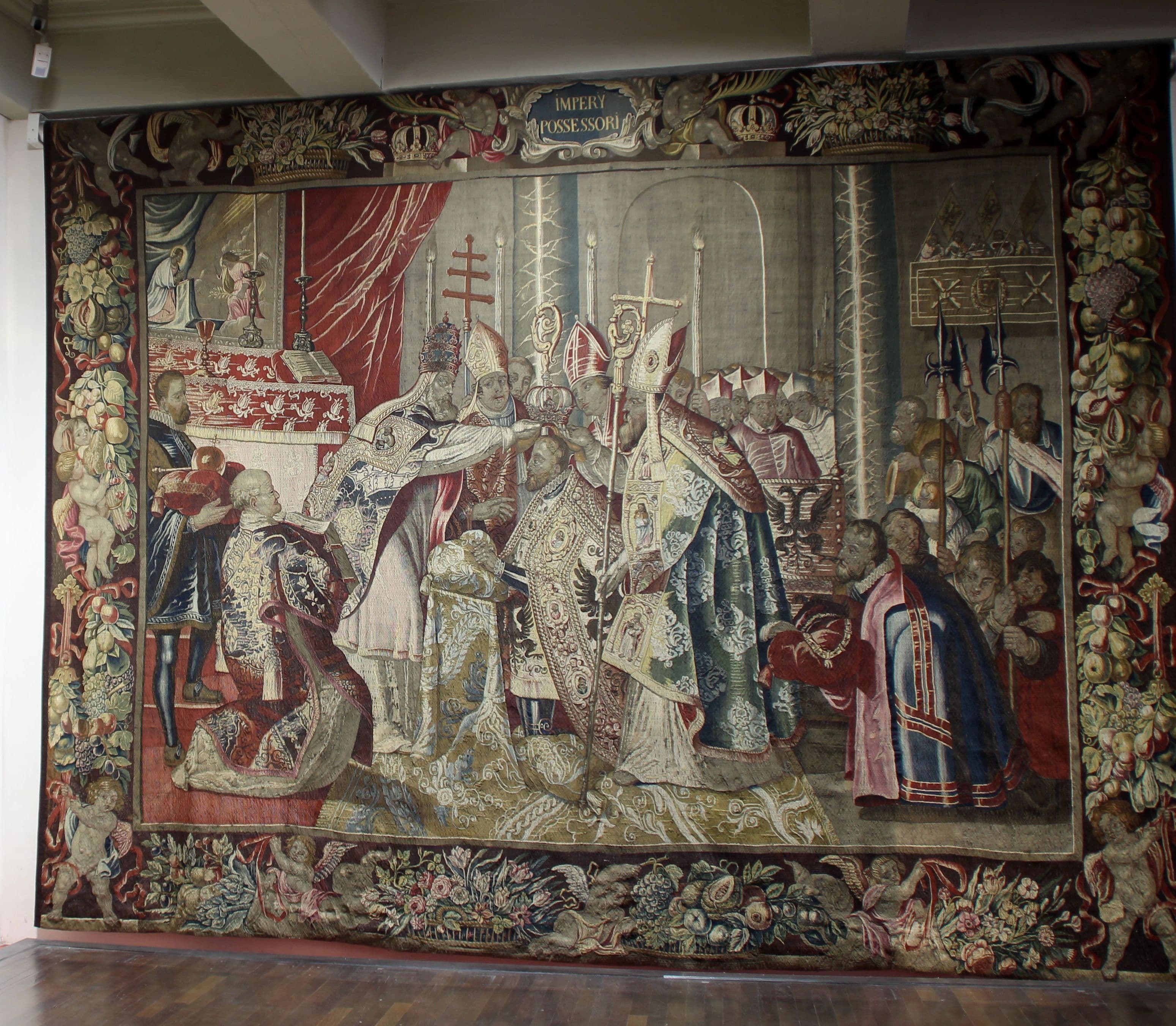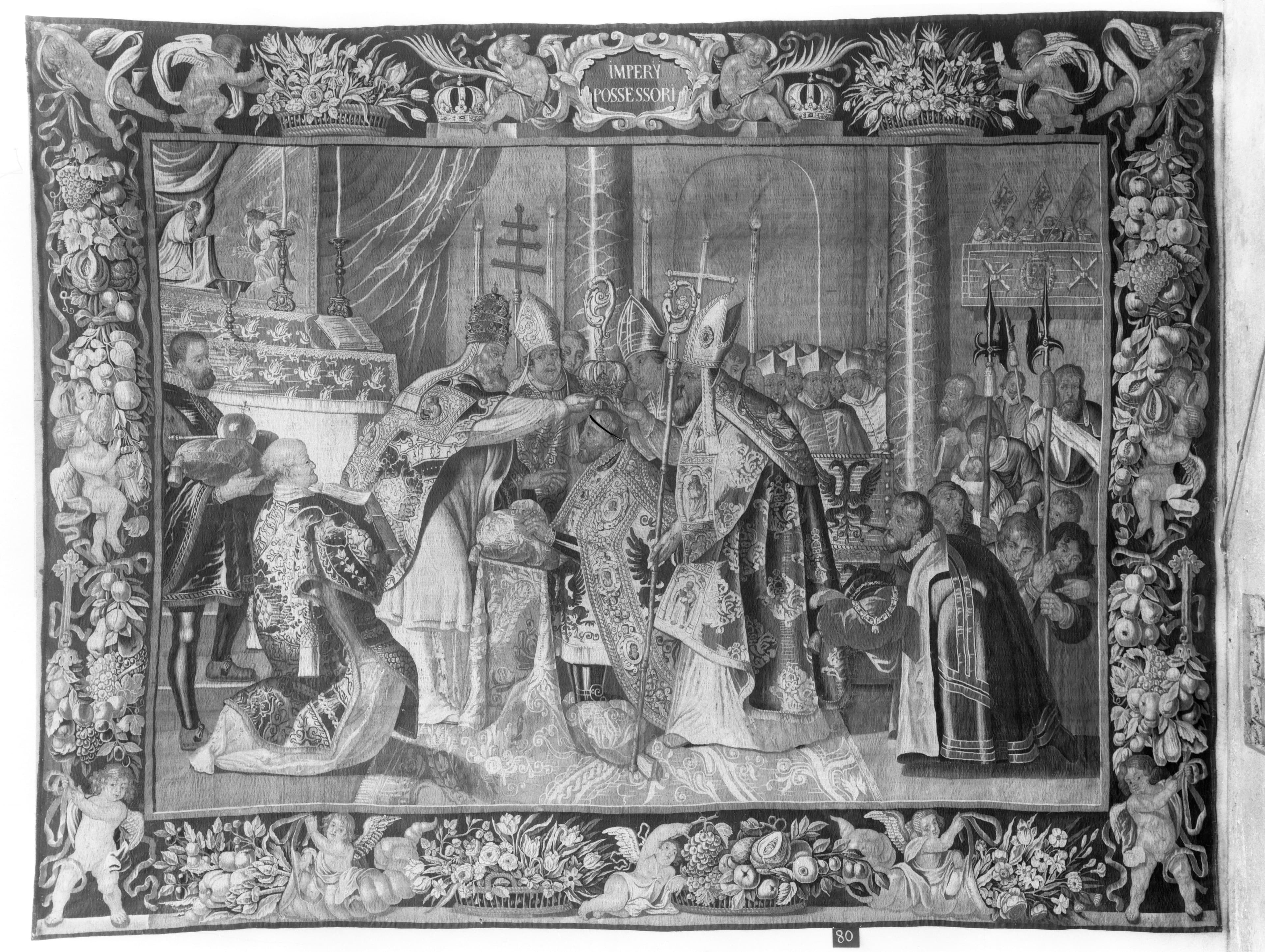 Le pape, mitre en tête, revêtu de ses habits sacerdotaux, couronne l'Empereur agenouillé sur un prie-Dieu. Inscription "B" gothique traversant une couronne et broche à tisser.