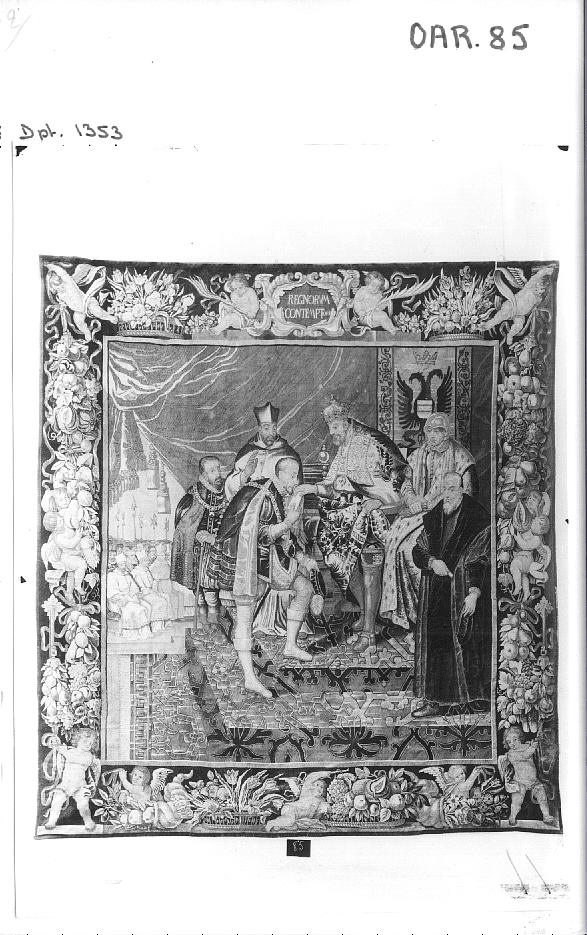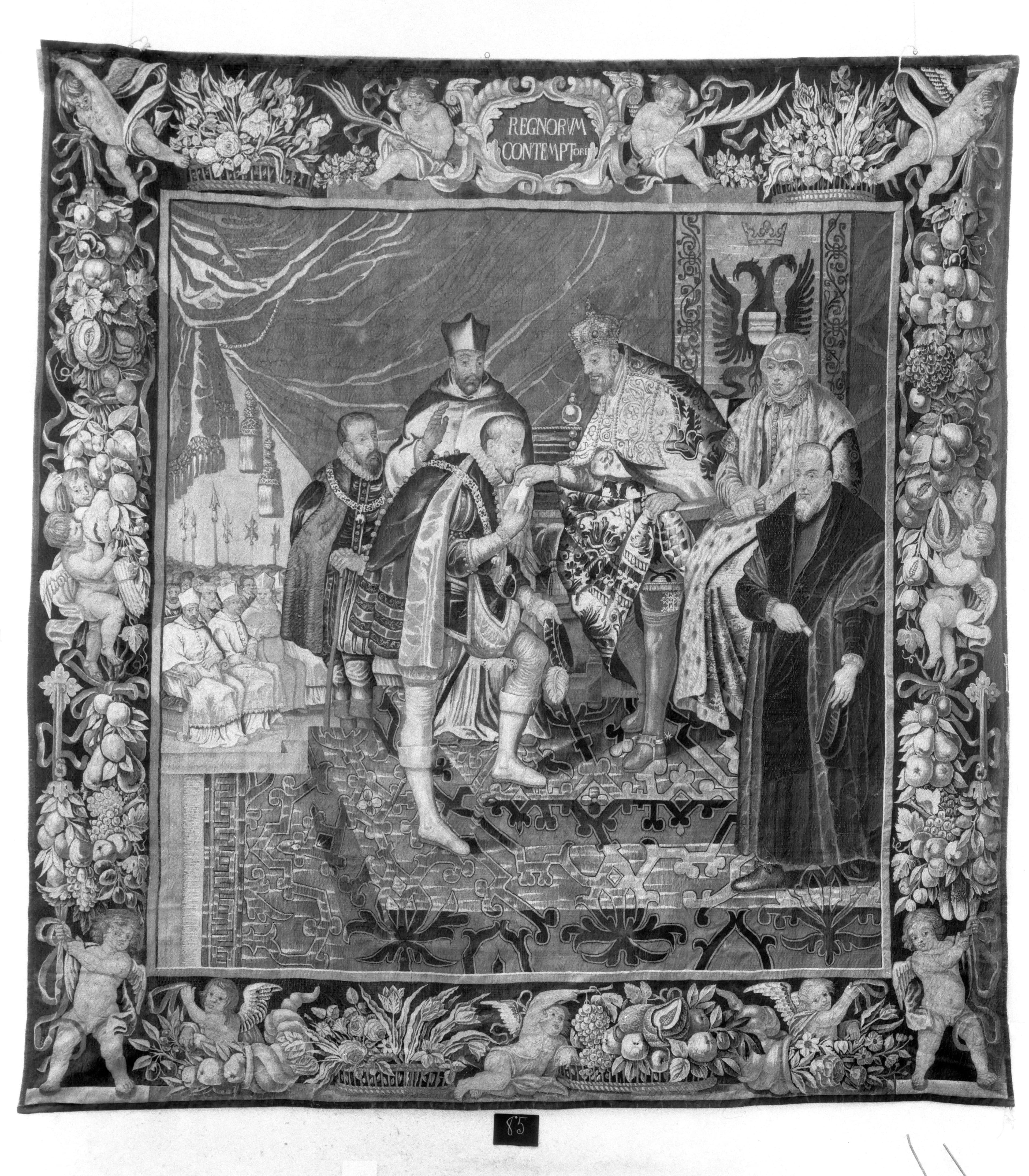 Suite de l'Histoire de Charles Quint (OAR 79-85) ; tapisseries à dominante rouge dont les bordures sont faites d'amours, de corbeilles et de paniers de fleurs, de cornes d'abondance et de guirlandes de fleurs et fruits au naturel ; au milieu de la bordure supérieure, un cartouche à inscription.