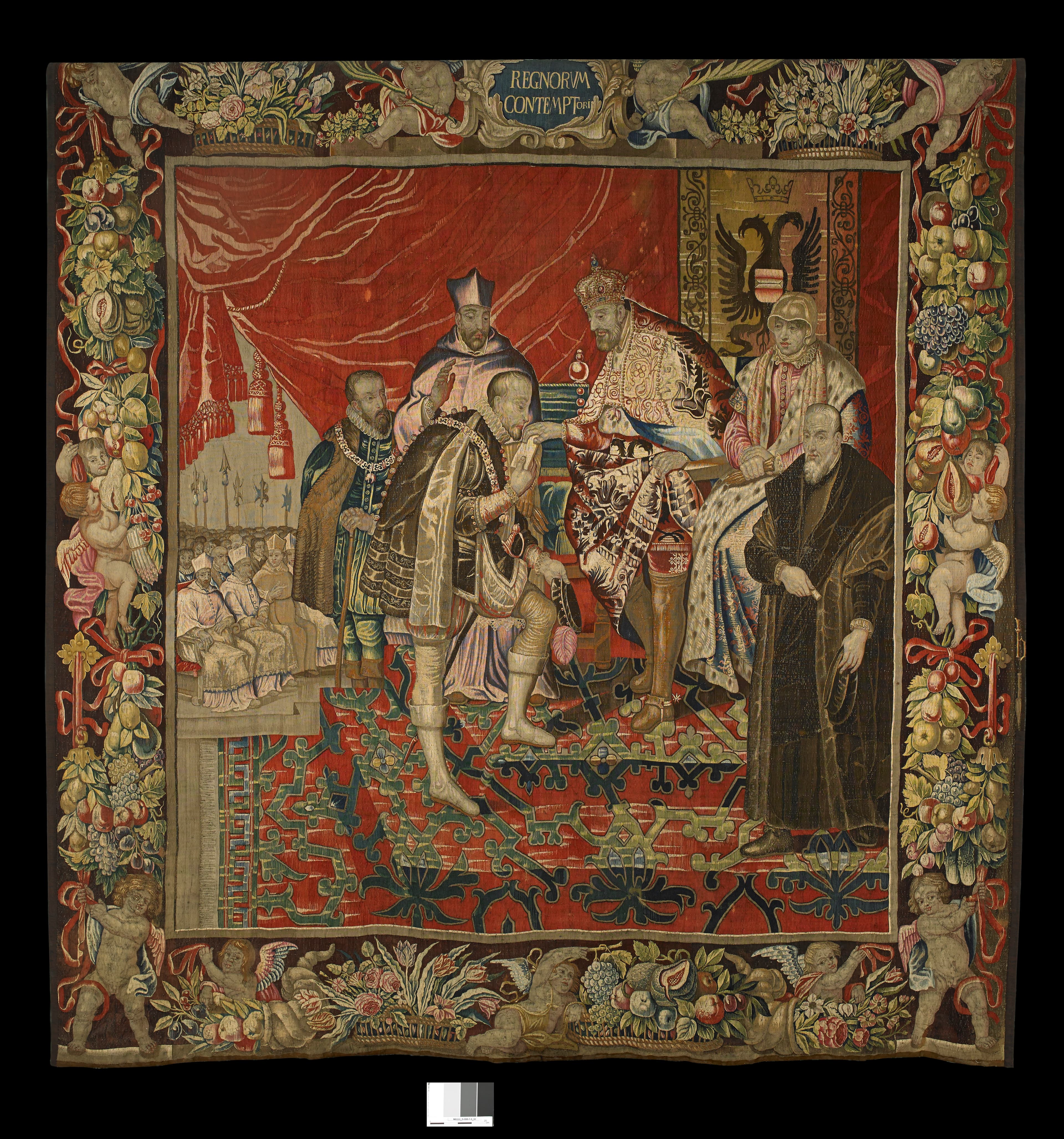 Philippe II (?), en manteau noir, est debout devant l'Empereur et lui baise la main ; autour d'eux, quatre personnages ; à gauche, la Diète d'Empire. Inscription "B" gothique traversant une couronne et broche à tisser.
