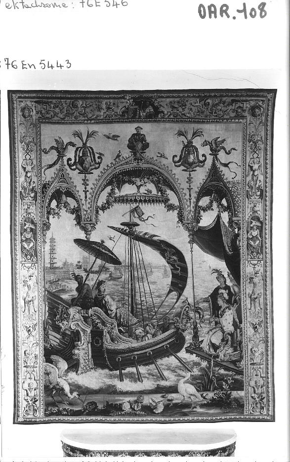 En 1938, le général Morgon décède et laisse à ses héritiers la tenture au Chinois composée de quatre tapisseries, évaluées 675.000 francs. Pendant la guerre, elles sont cachées dans une ferme de l'Eure. En mars 1944, les héritiers décident de vendre la tenture, restée en indivision, à Nicolas Matzneff. Celui-ci l’achète 8 millions de francs. Pour réaliser cet achat, Nicolas Matzneff emprunta cinq millions à la banque de l'Union Parisienne où les tapisseries furent entreposées en gage (2). Nicolas Matzneff, qui se faisait passer pour le comte de Larie, vend le 1er juillet 1944 la tapisserie " L'embarquement de la princesse " ainsi que les trois autres tapisseries de la tenture, à Hildebrand Gurlitt, fournisseur du Landesmuseum de Linz. Gurlitt achète ces quatre tapisseries 2.200 000 RM, soit la somme de quarante-quatre millions de francs, objets les plus chers jamais achetés pour le musée de Linz (3). C'est Théo Hermsen, marchand hollandais et intermédiaire de Hildebrand Gurlitt, qui se chargea de la transaction. Envoyées en Allemagne, il semble que les tapisseries aient transité par la Städtische Gemälde Galerie de Dresde, dont le directeur Hermann Voss, était également chargé du musée de Linz (4). Les quatre tapisseries furent inventoriées dans le fonds du futur musée de Linz, sous le numéro XXIV/3/12 (5).
