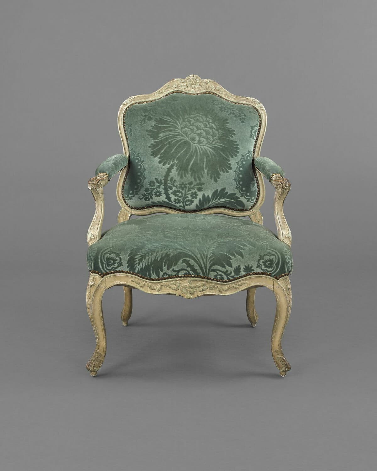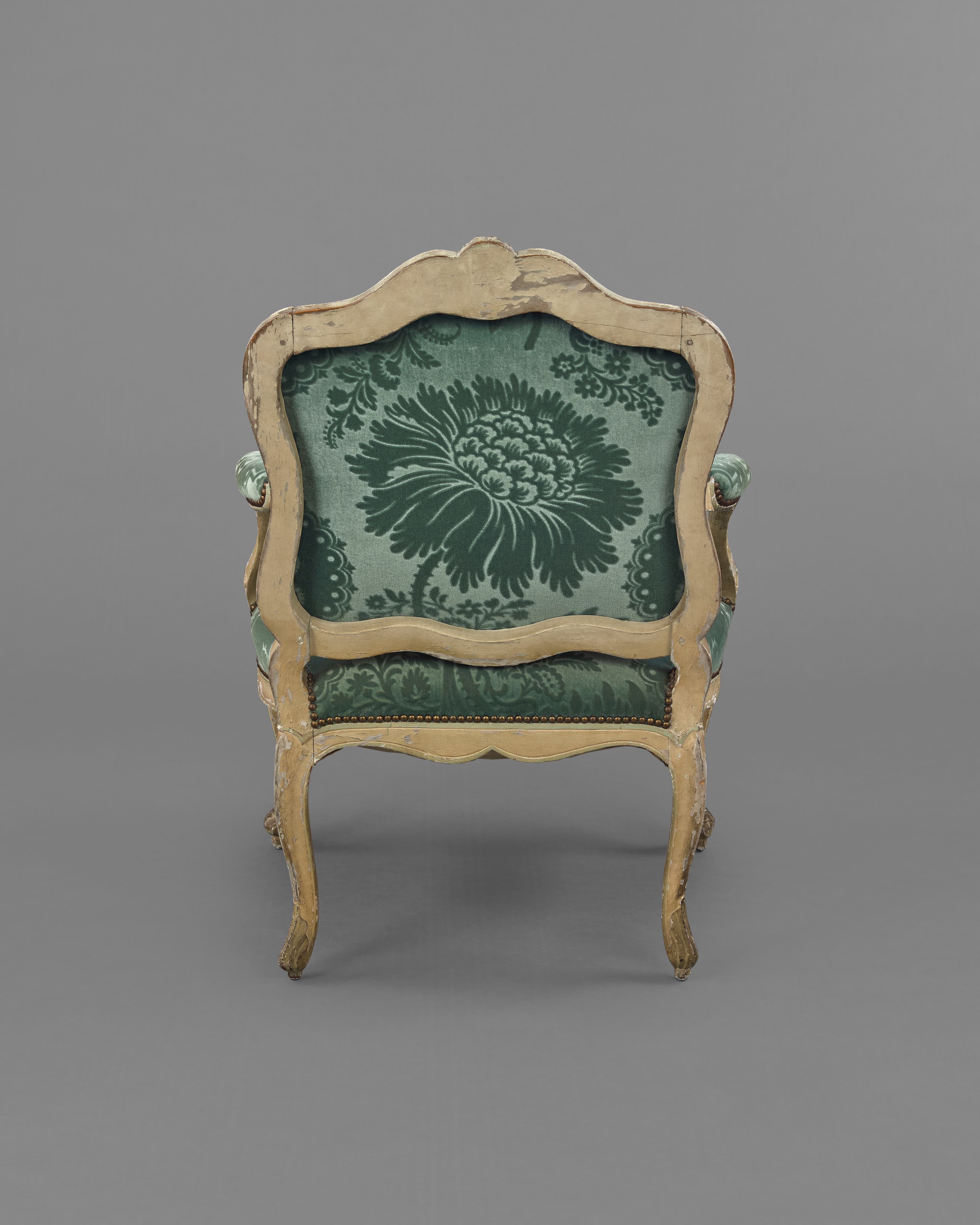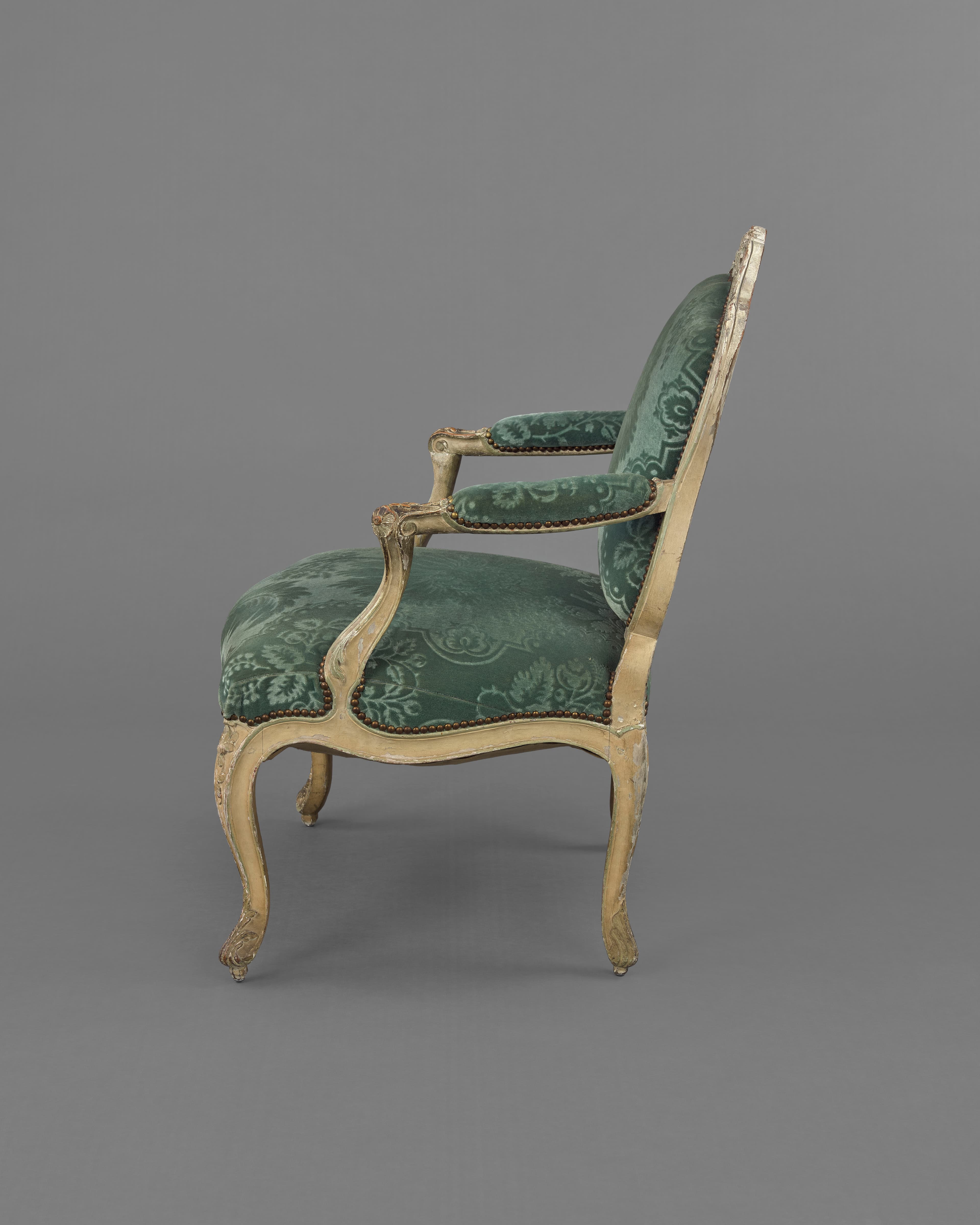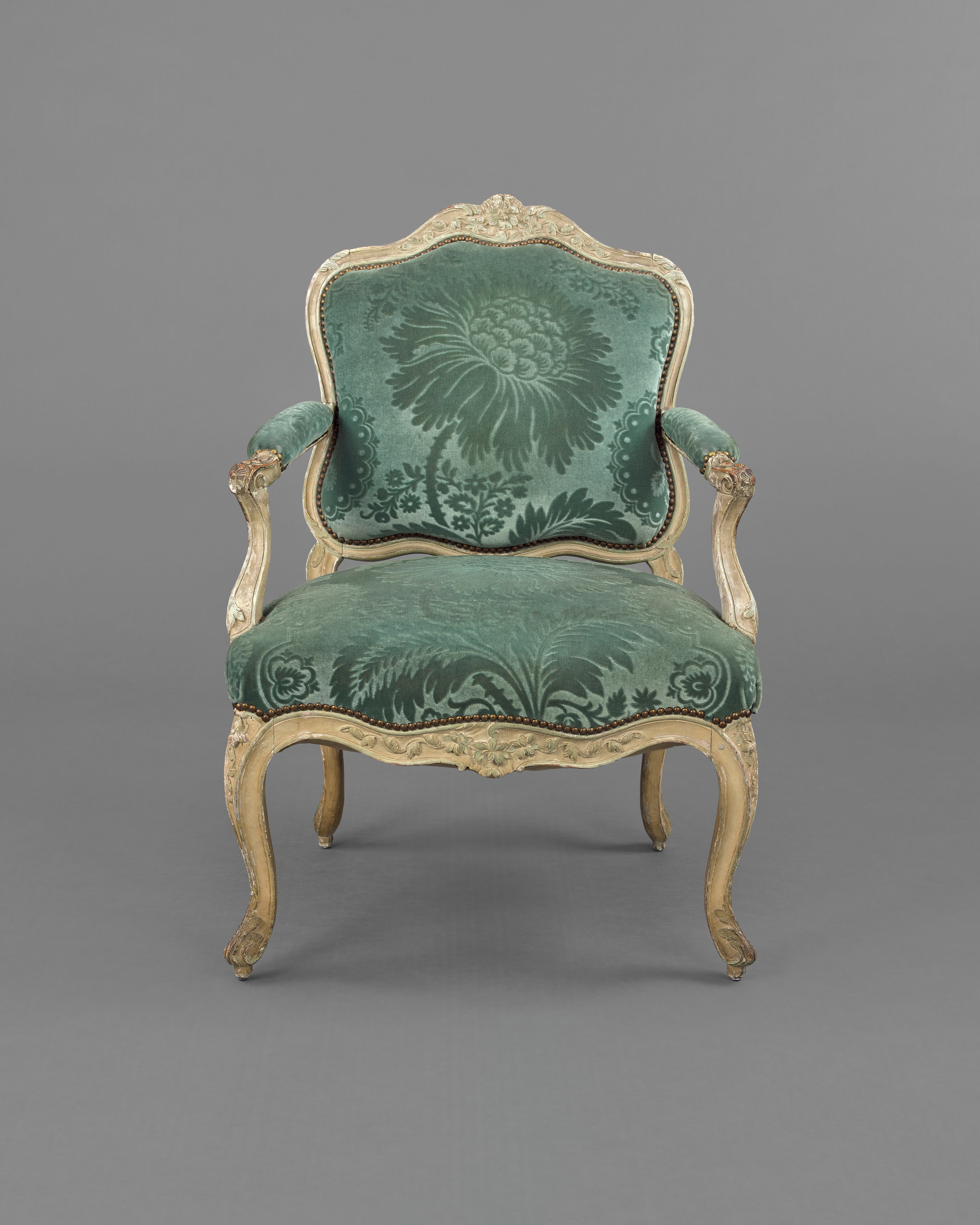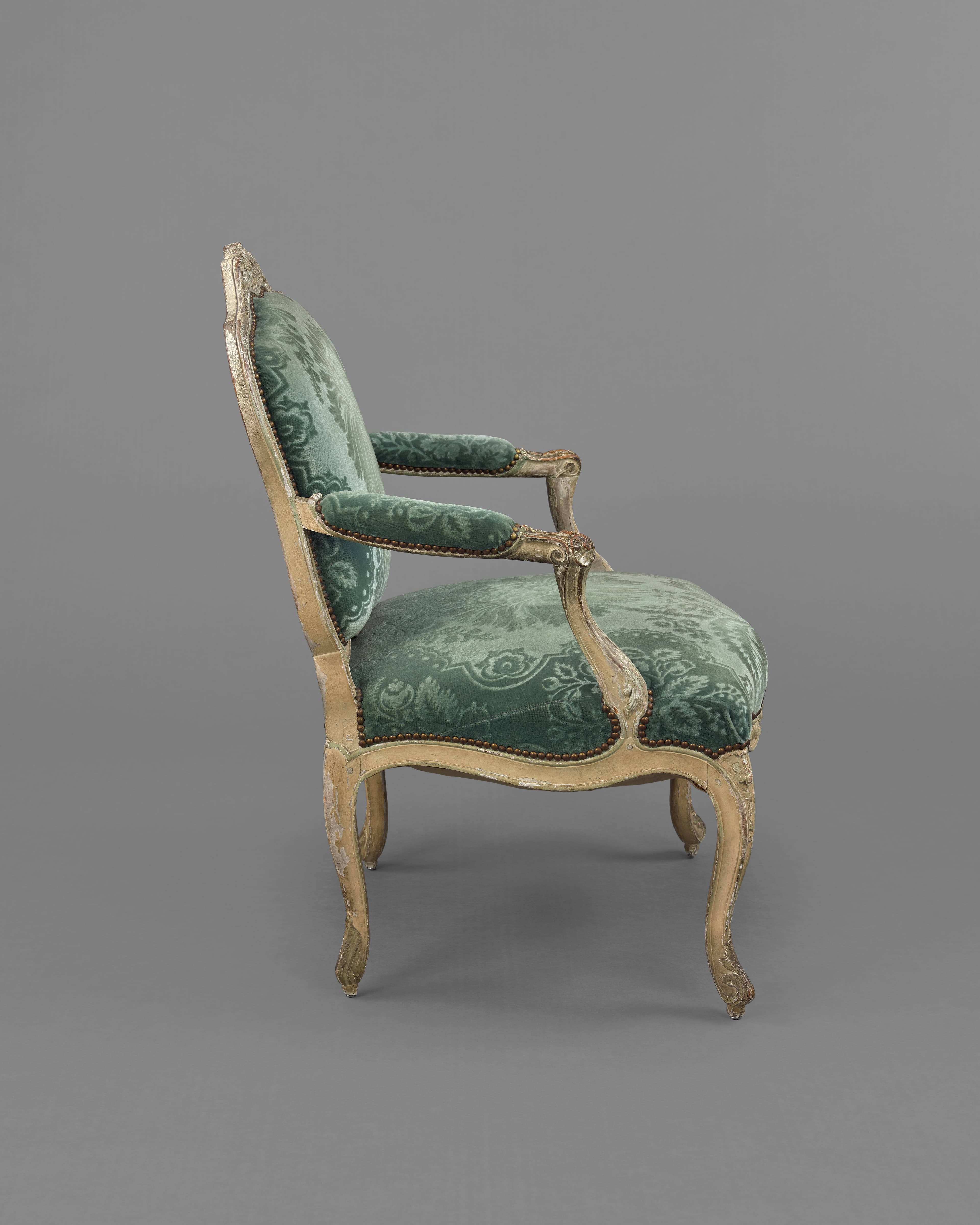 Fauteuil en bois sculpté de rameaux fleuris, à l’origine peint en vert et or et garni de satin grenat à grandes fleurs vertes et or. Le dossier de forme contournée ; les accoudoirs à manchettes et supports en console ; les pieds cambrés. Dans l'état actuel, la dorure a été remplacée par un rechampi vert, et le fauteuil est recouvert d'un velours vert à motif de grandes fleurs et feuillages.