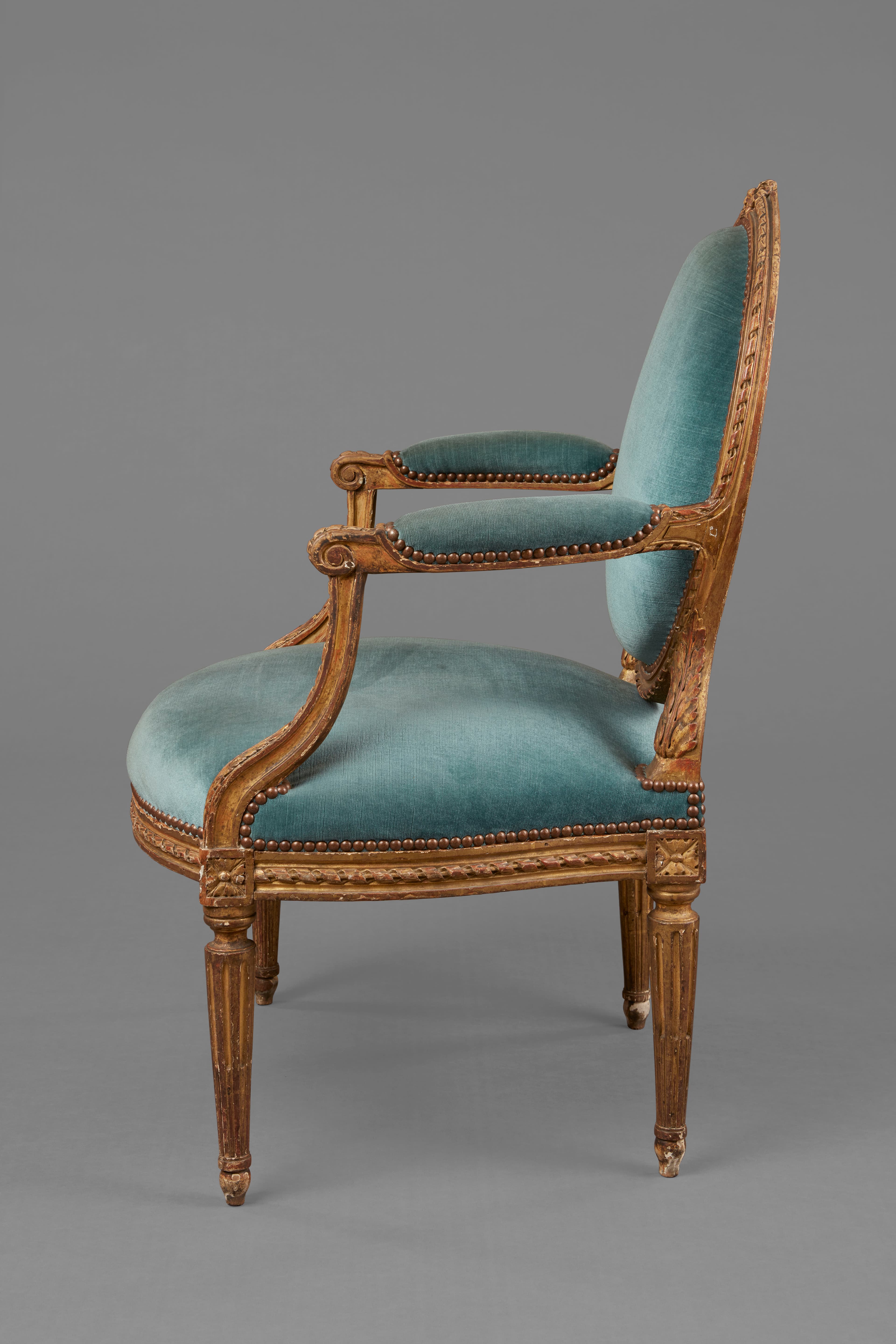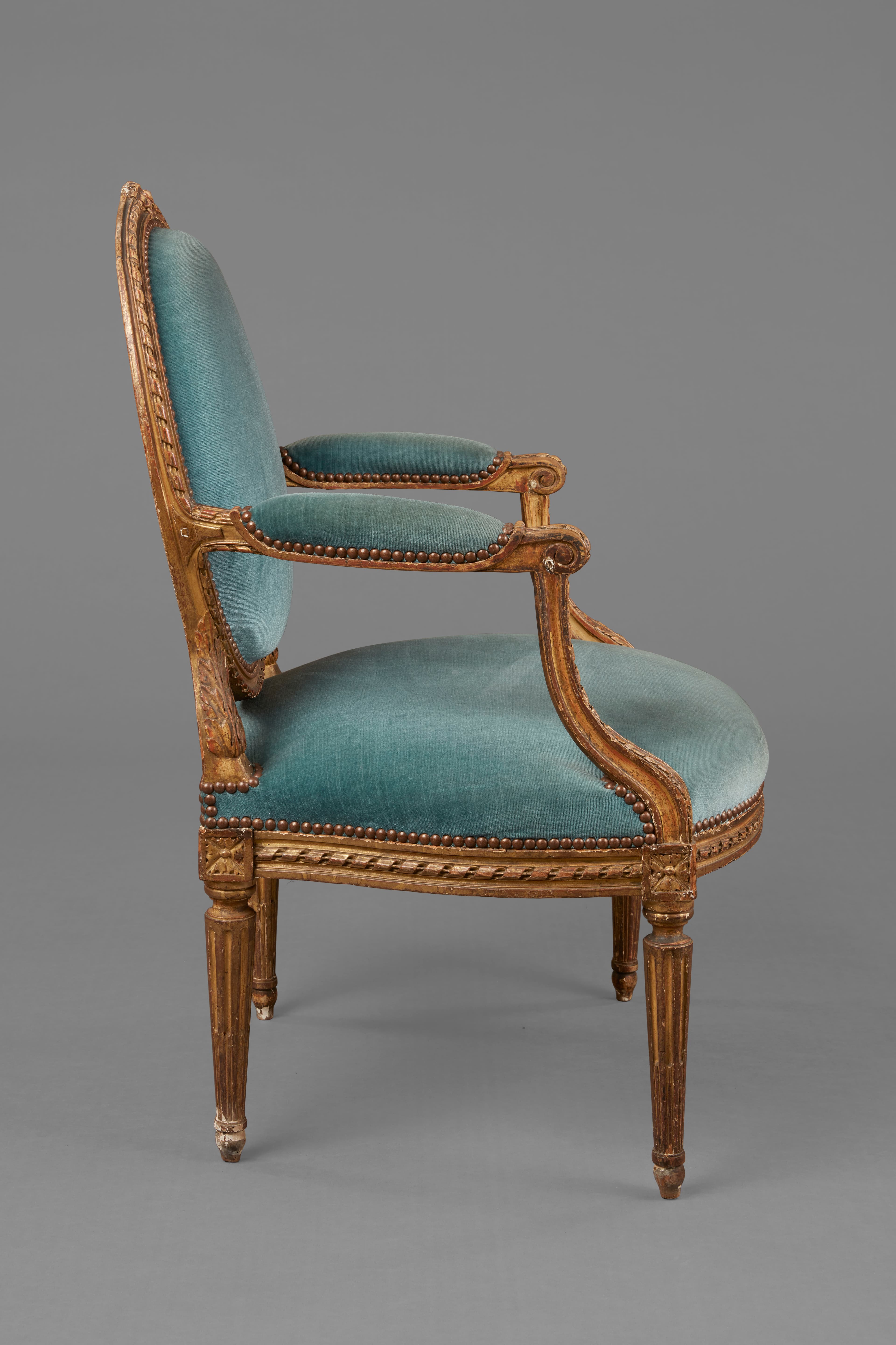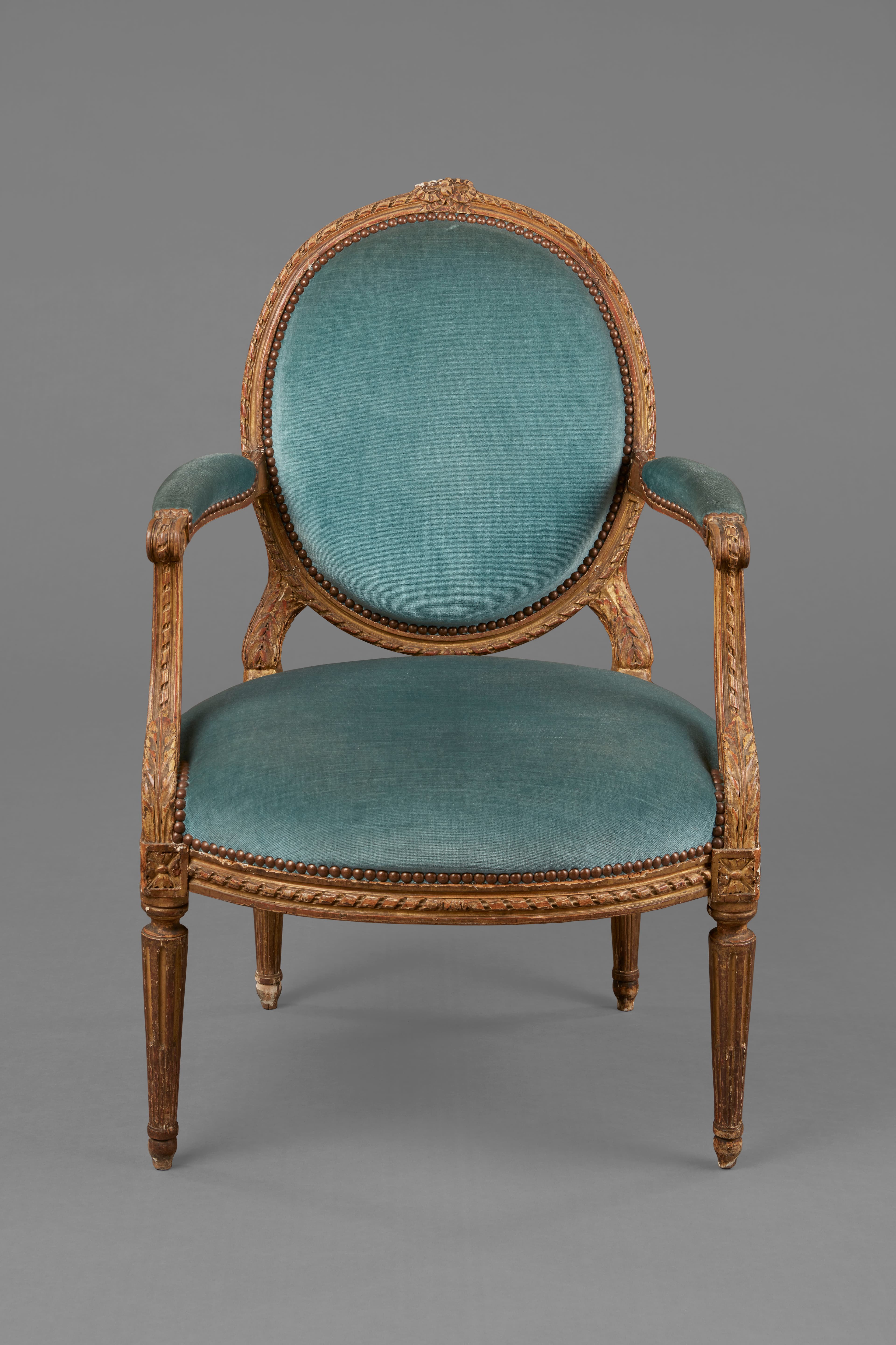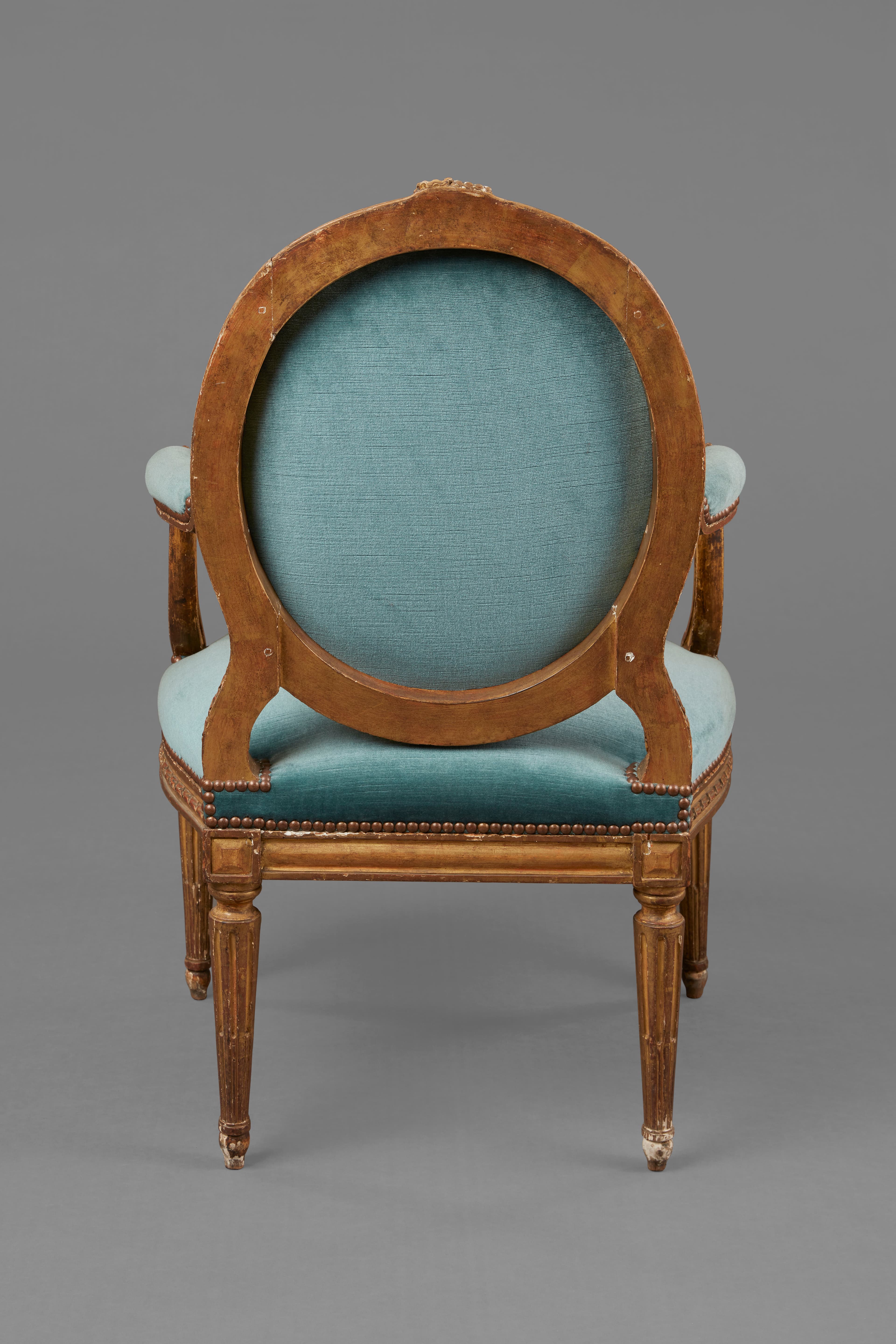 Fauteuil de bois sculpté et doré. Le dossier ovale est décoré d'un ruban torsadé et d'un nœud de ruban à la partie supérieure. Accoudoirs à manchettes et supports à ruban torsadé et feuille d'acanthe ; dés à rosaces, ceinture à ruban ; pieds fuselés et cannelés ; actuellement garniture de velours bleu, rouge à l'origine.